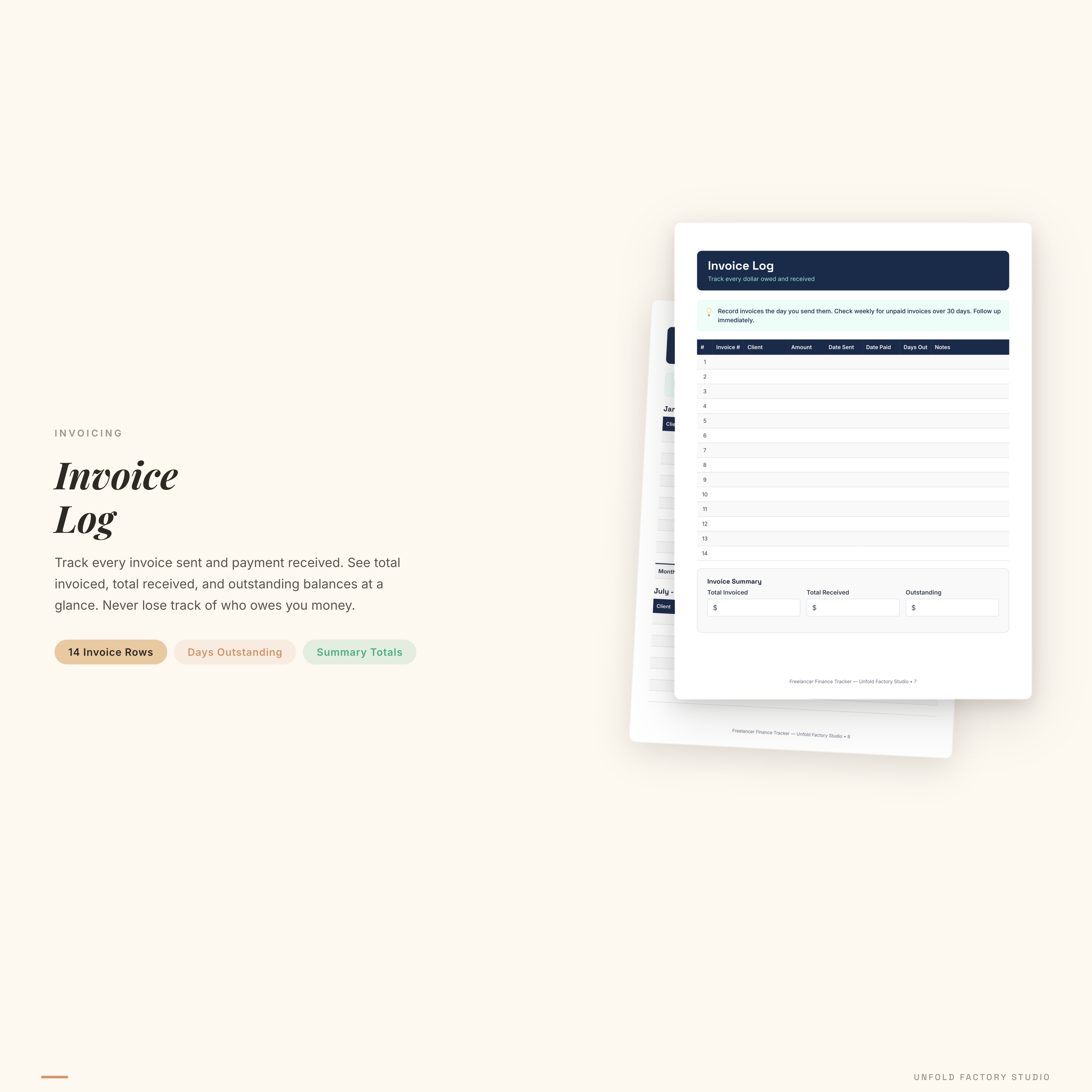 - Invoice Log — 14-row tracker with amounts, dates sent and paid, days outstanding, plus totals for invoiced, received, and outstanding balances.