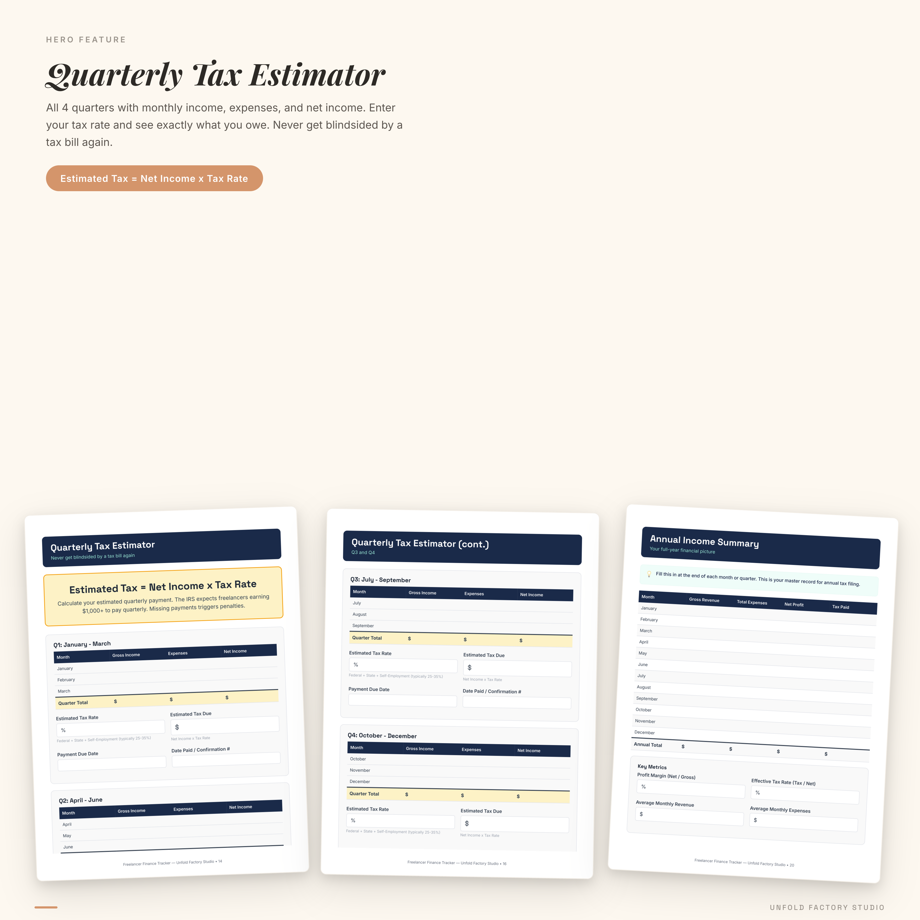 Track clients, invoices, expenses, and quarterly taxes in one printable binder. Built for freelancers who want paper-simple finance tracking without subscription software. 5 minutes a day keeps tax season stress-free.