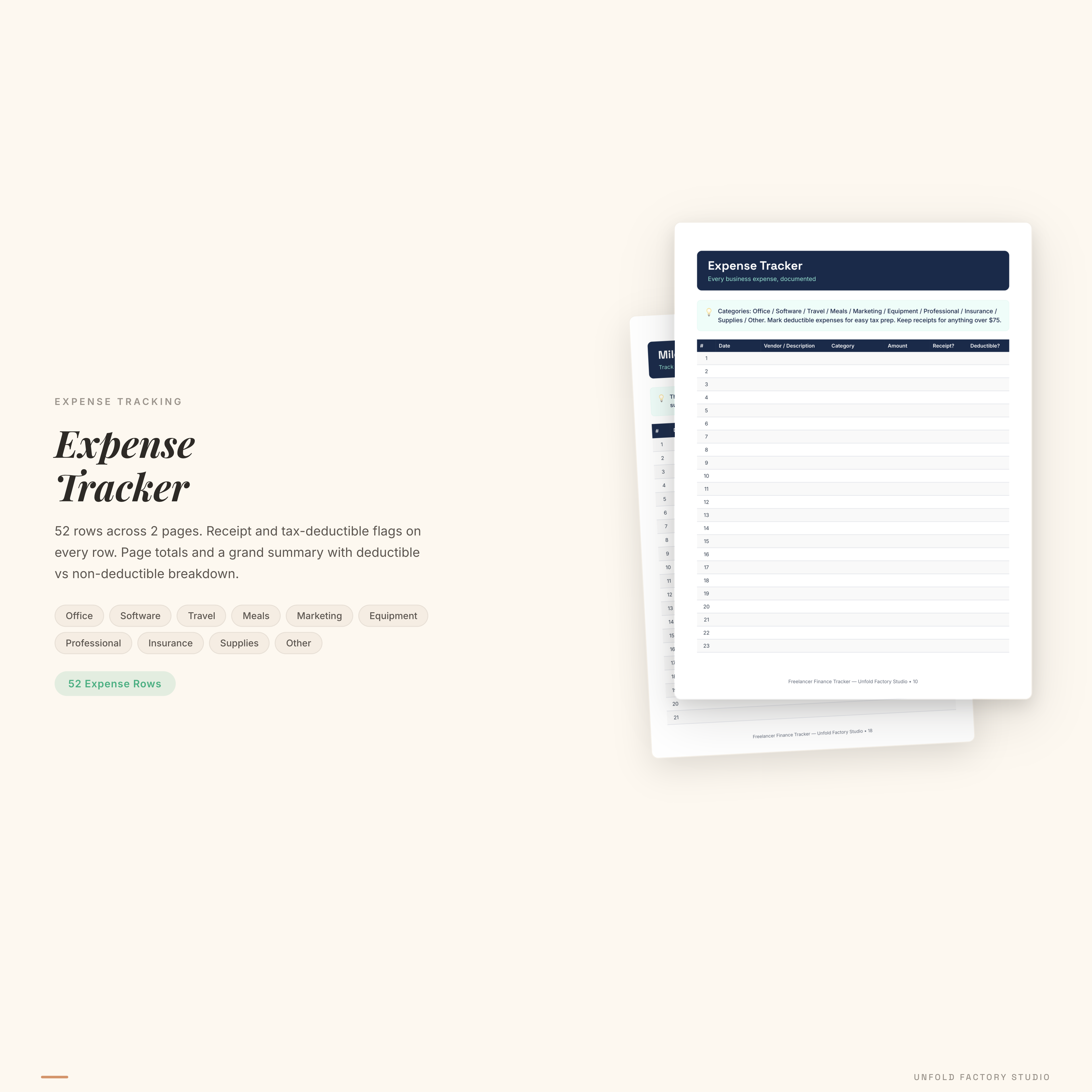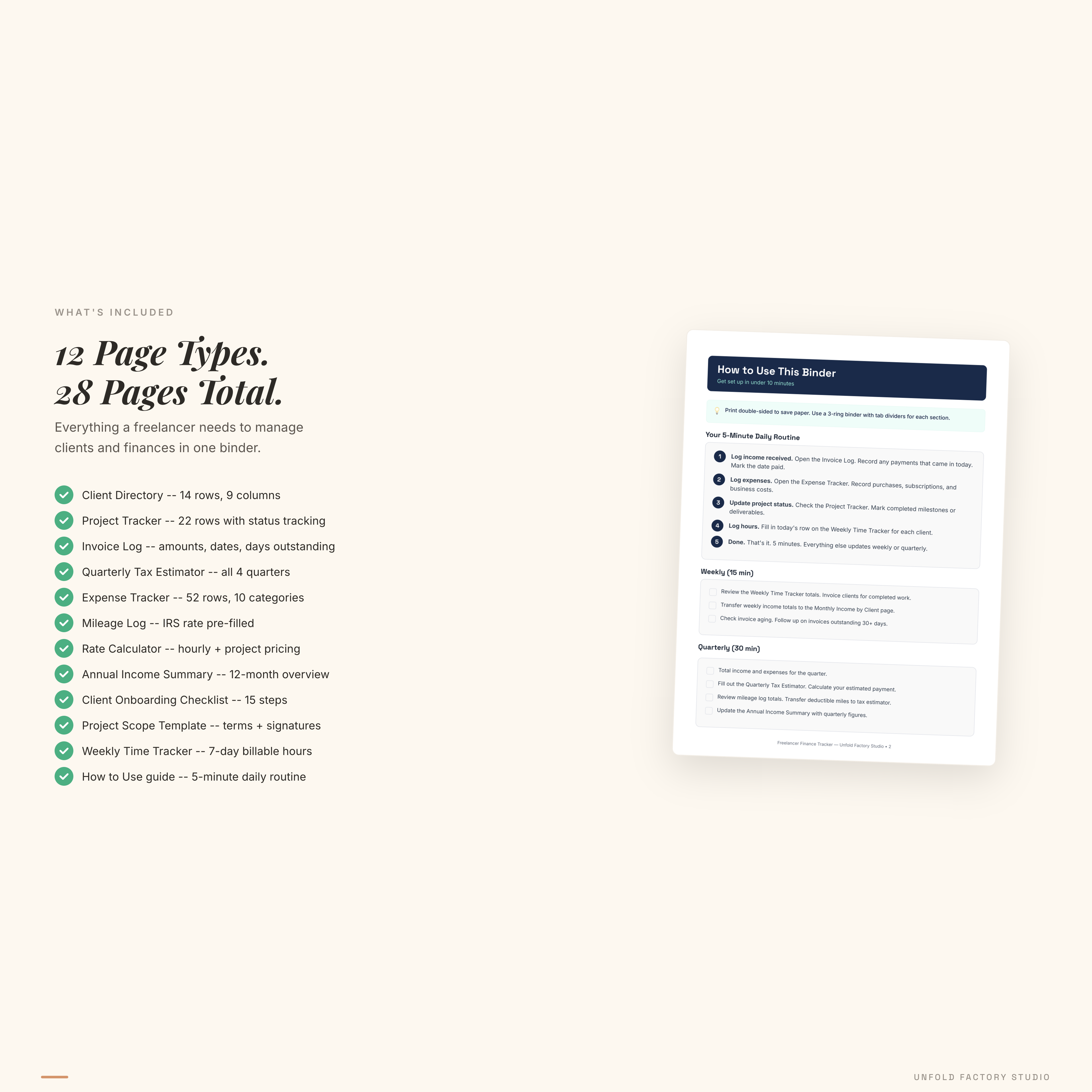Unfold Factory Studio’s Freelancer Client & Finance Tracker is a complete business management system for freelancers, consultants, and gig workers. 28 pages of structured trackers, calculators, and planning tools — printed and placed in a binder you actually use every day.