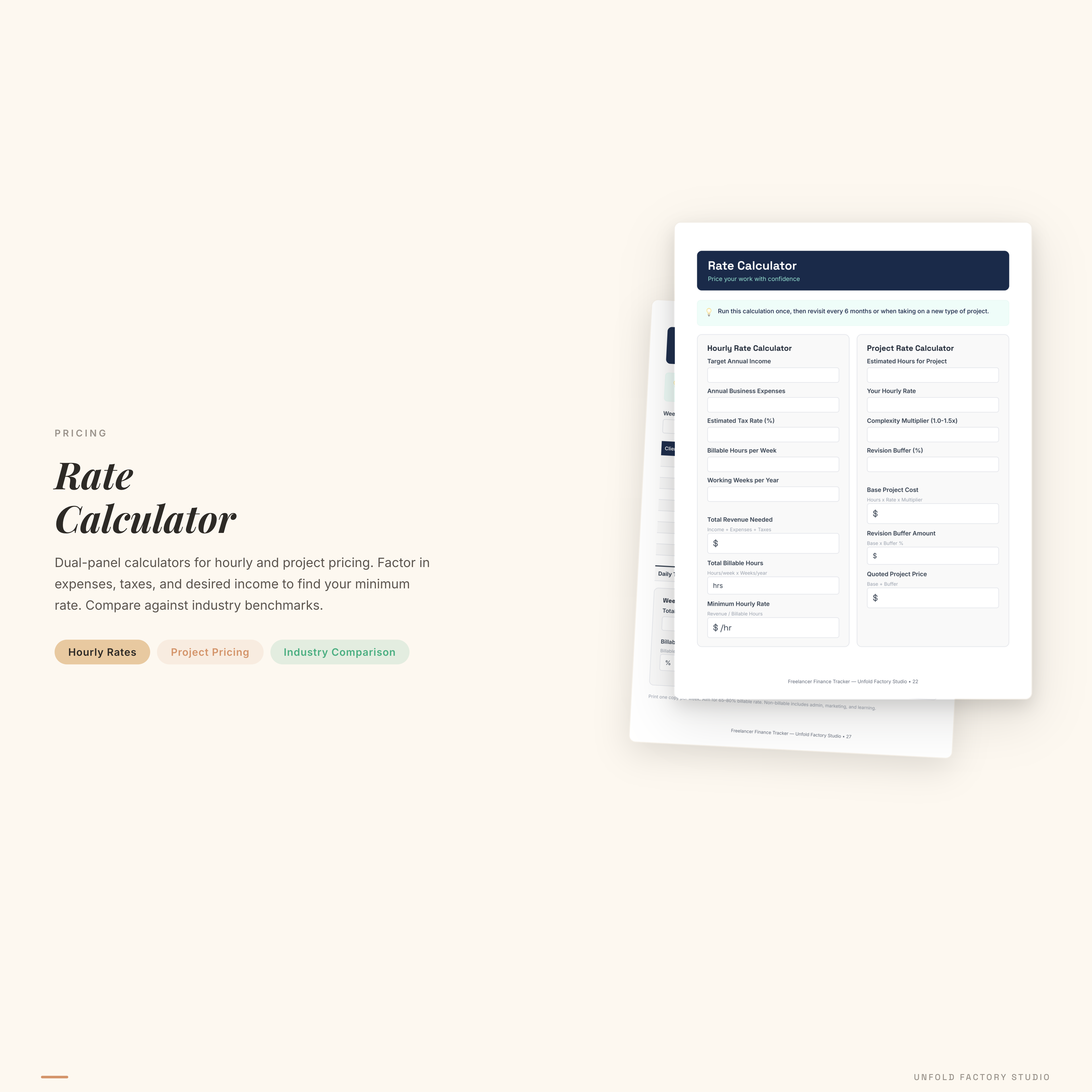 - Rate Calculator — dual-panel hourly and project rate calculators with industry comparison fields. Price your work with confidence.