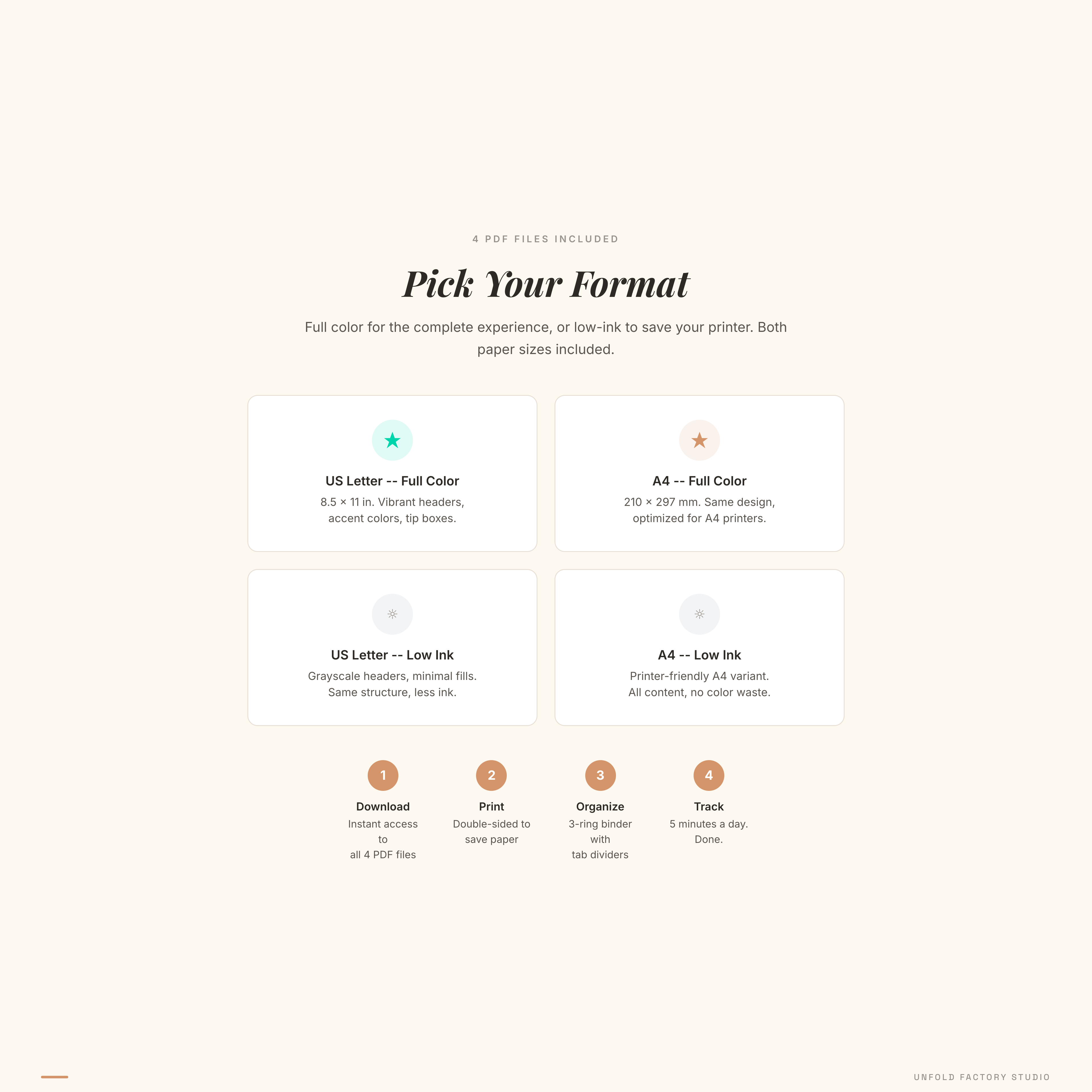 Q: What format is this in? A: You receive 4 PDF files — US Letter and A4, each in full color and low-ink versions. Download, open in any PDF reader, and print.