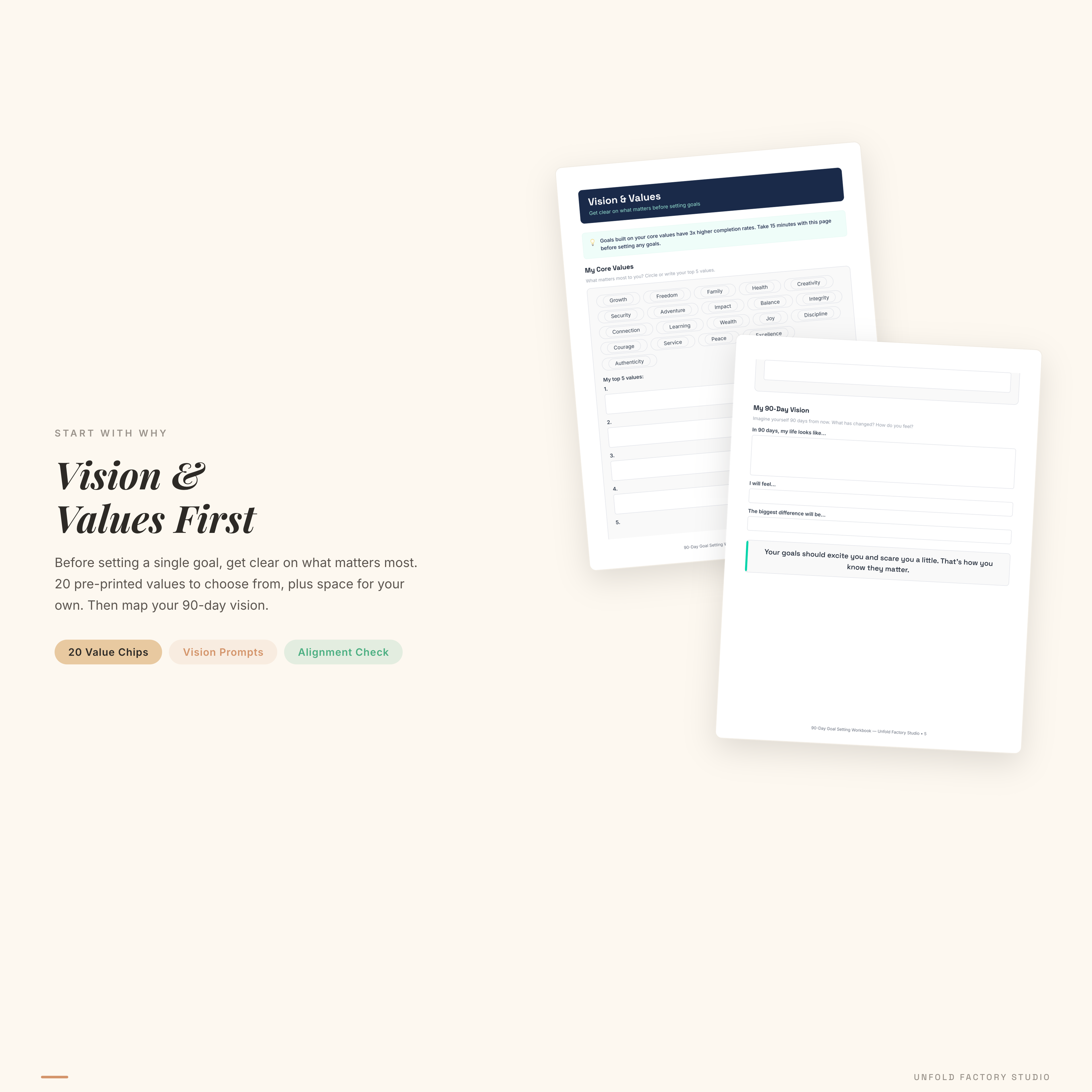 - Vision and Values Clarification — identify what actually matters to you before setting a single goal. 20 pre-printed values to circle plus space for your own.