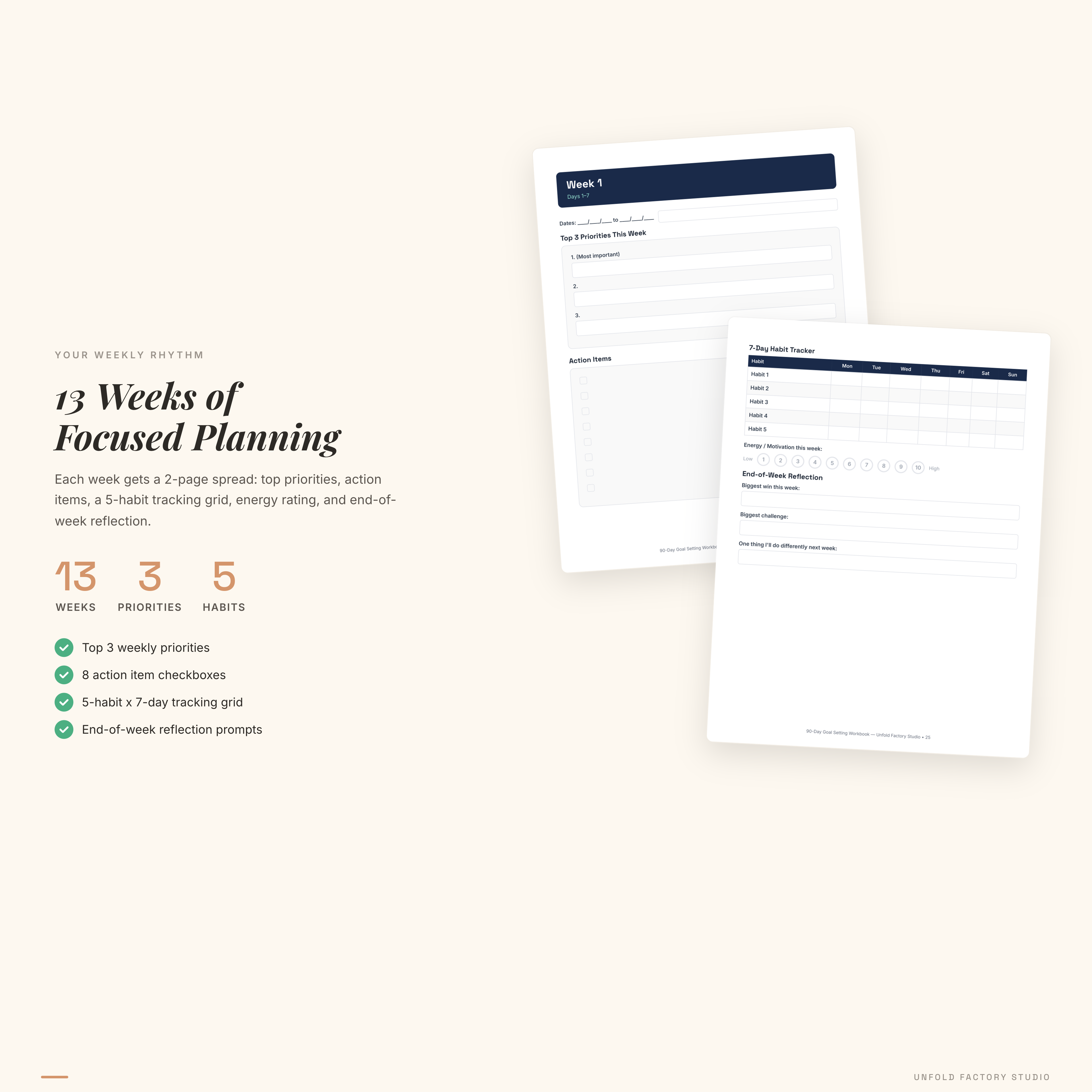 - Weekly Planning Pages (x13 weeks) — top 3 priorities, 8 action item checkboxes, a 5-habit 7-day tracking grid, energy and motivation rating, end-of-week reflection prompts.