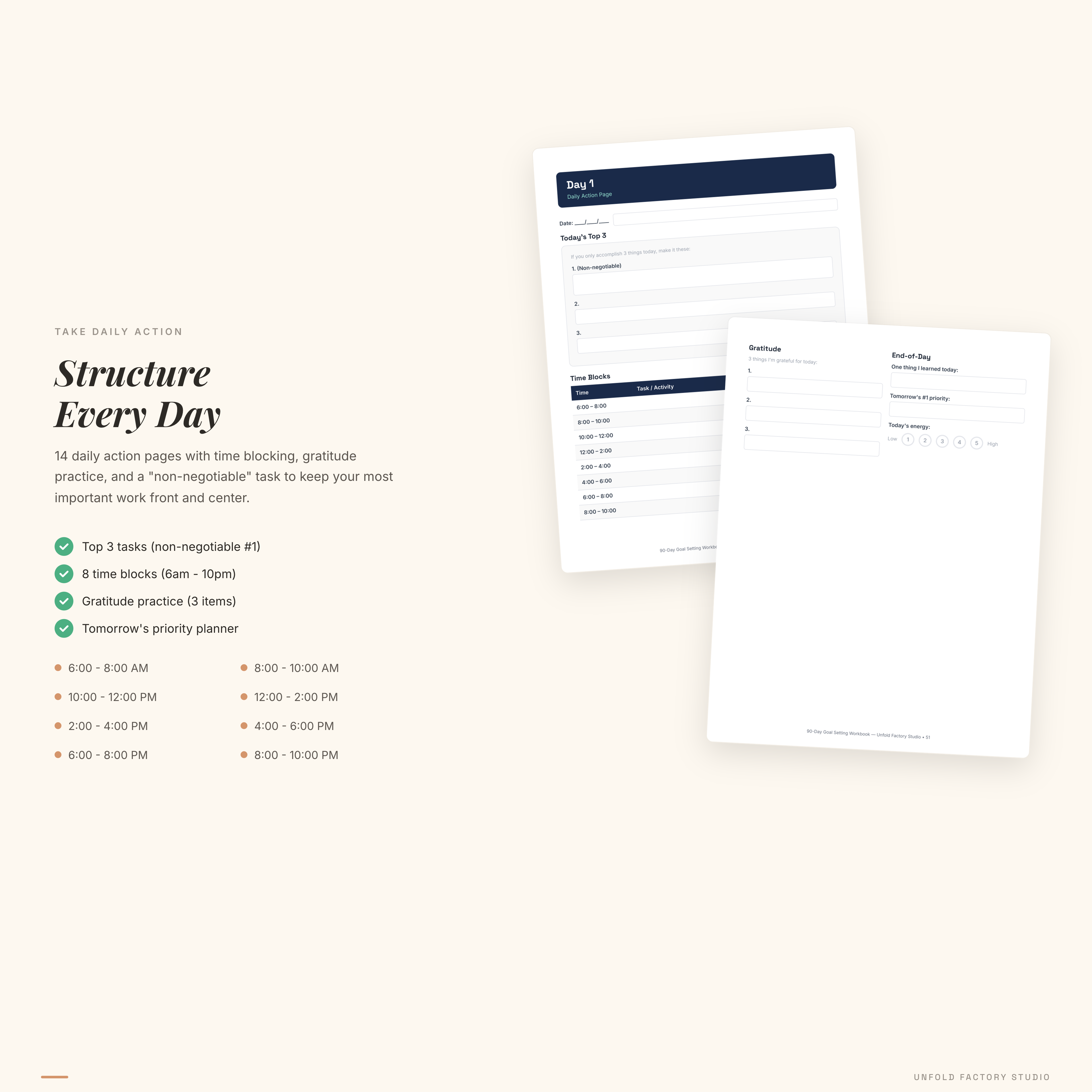 - Daily Action Pages (x14 days) — today’s top 3 tasks with “non-negotiable” framing, 8 time blocks from 6am to 10pm, gratitude practice, and tomorrow’s priority. Reprint as needed.