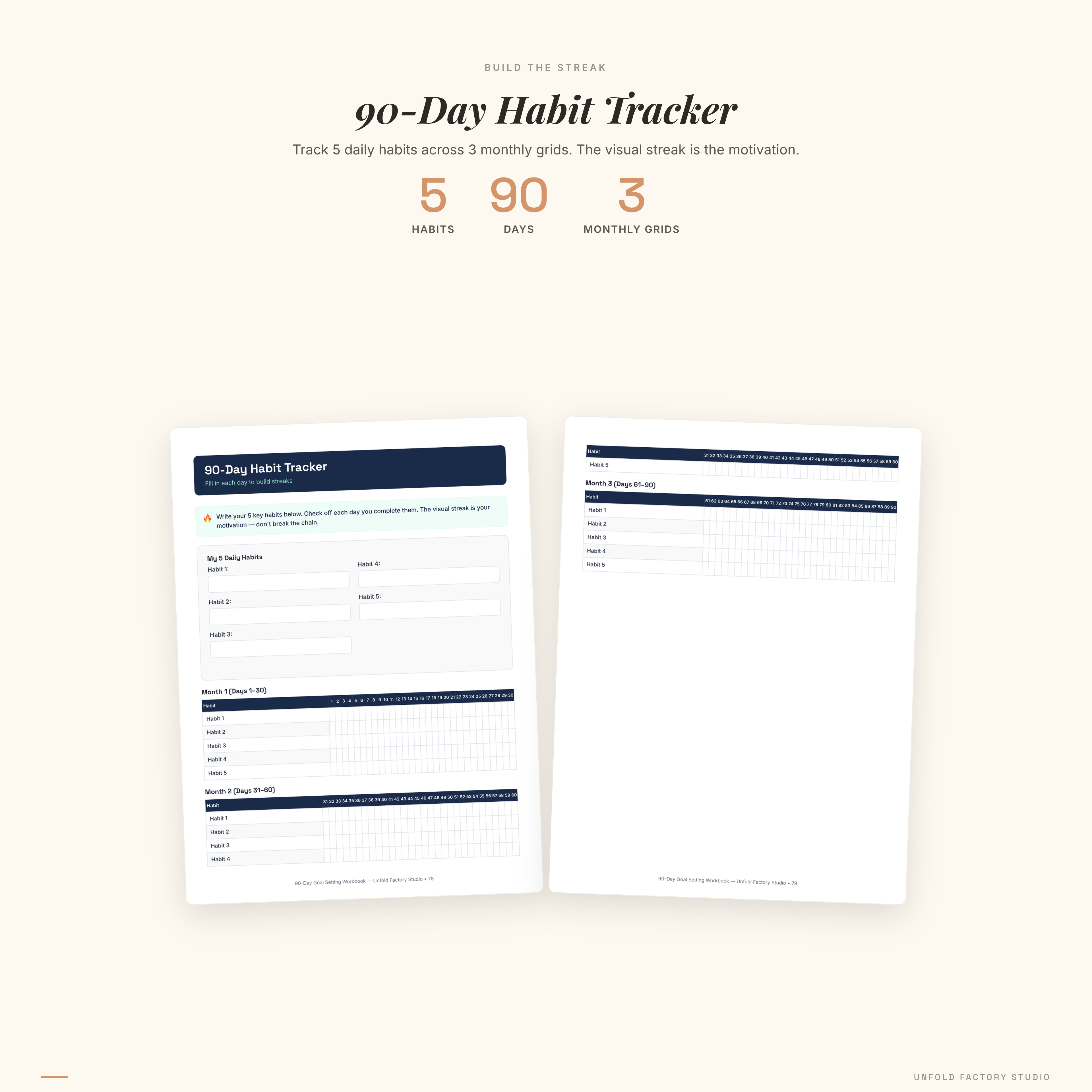 - 90-Day Habit Tracker Grid — 5 habits across 90 days split into 3 monthly sections. The visual streak is the motivation.