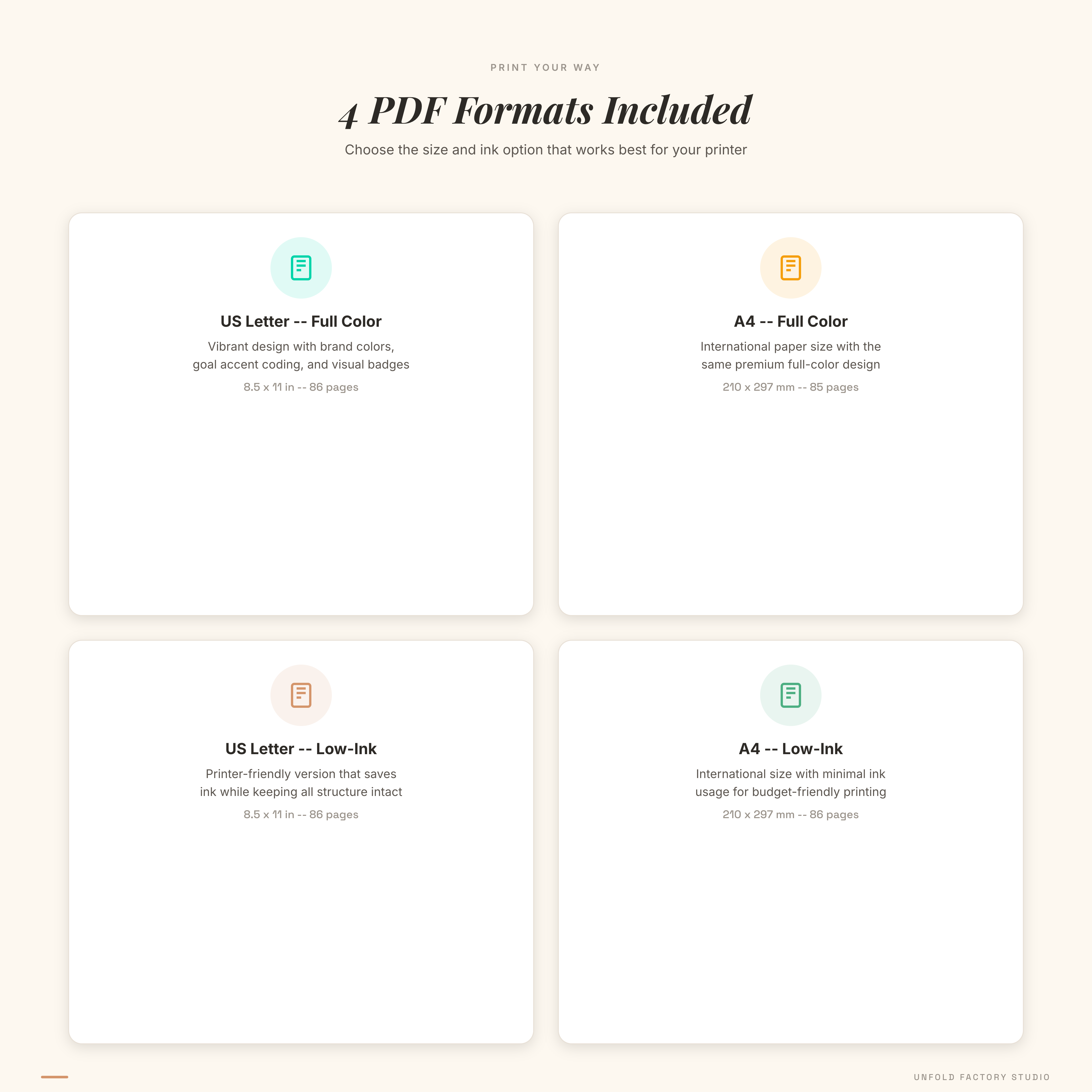 Q: What format is this in? A: You receive 4 PDF files — US Letter and A4, each in full color and printer-friendly low-ink versions. Download, open in any PDF reader, and print the pages you need.