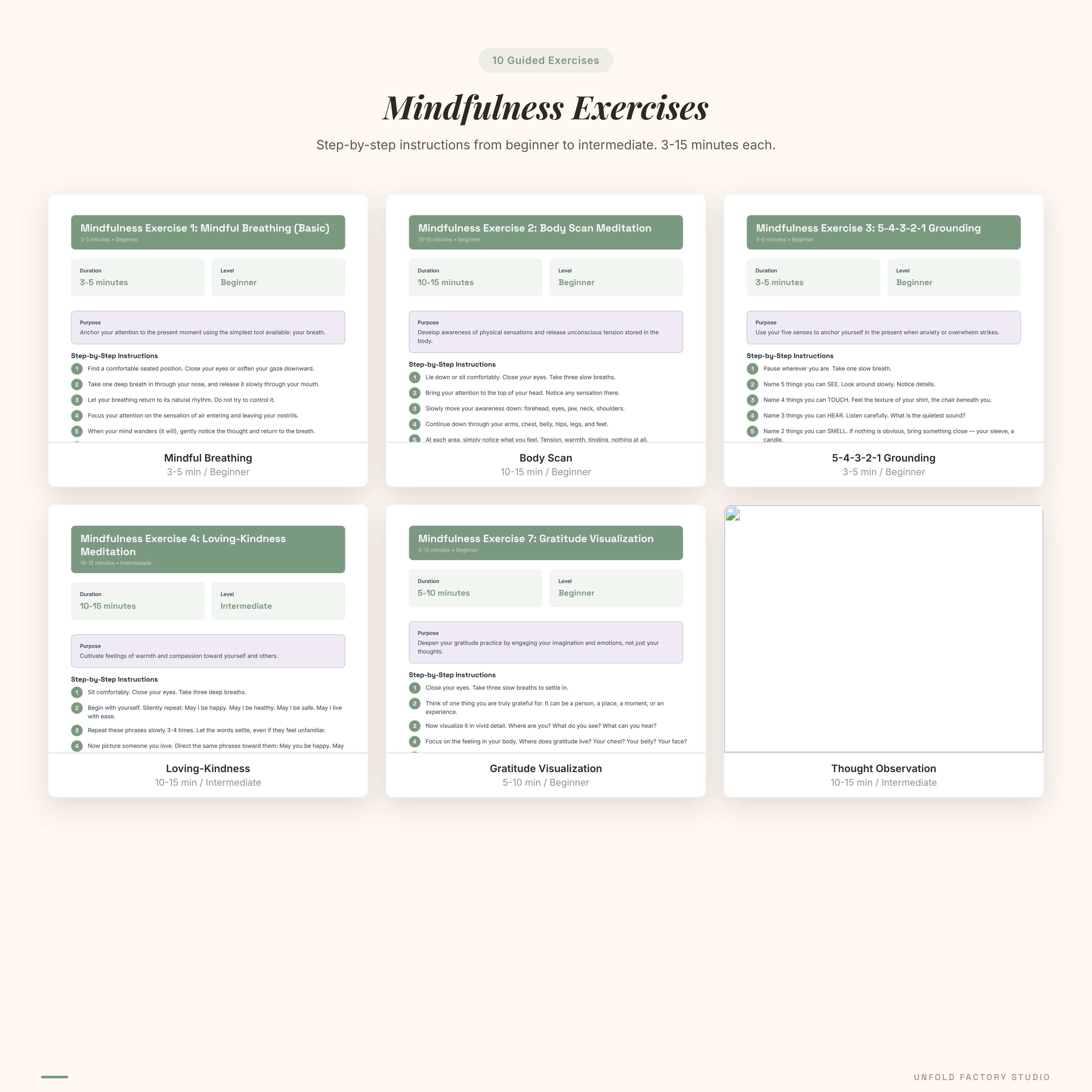 - 10 guided mindfulness exercises with step-by-step instructions, from beginner breathing to intermediate loving-kindness meditation