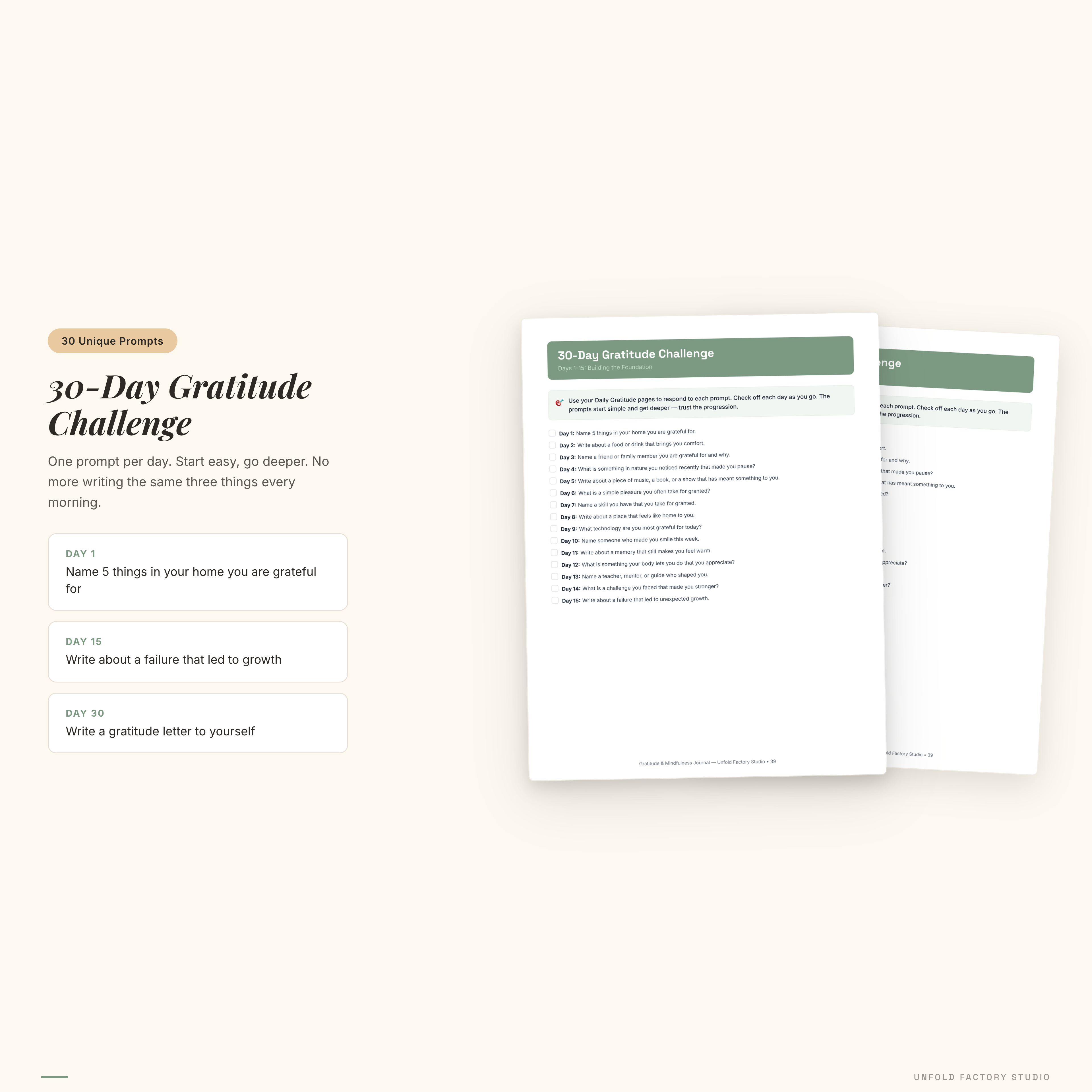 - 30-day gratitude challenge with unique daily prompts that progress from surface-level to deep reflection