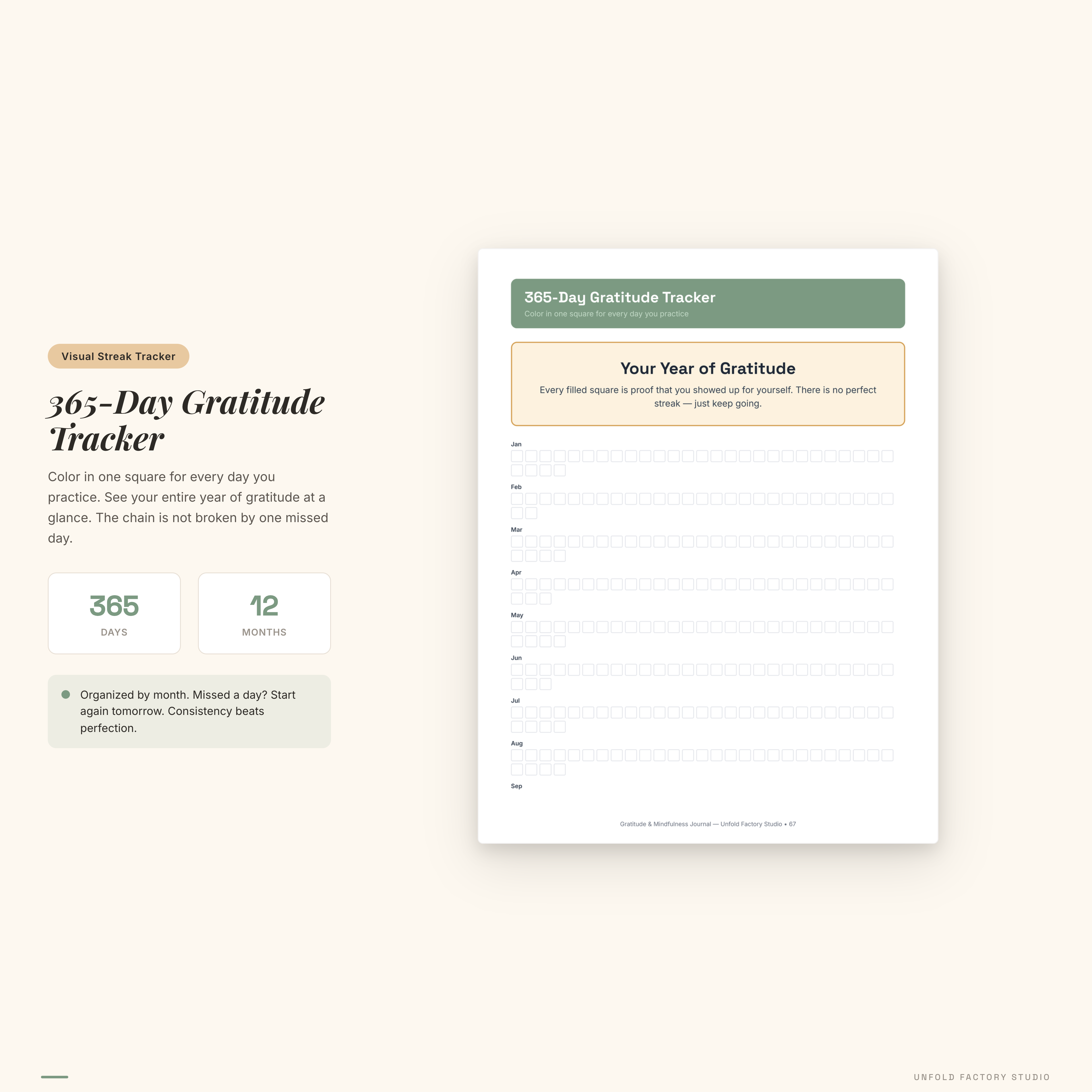 - 365-day gratitude tracker grid organized by month so you can see your consistency across an entire year