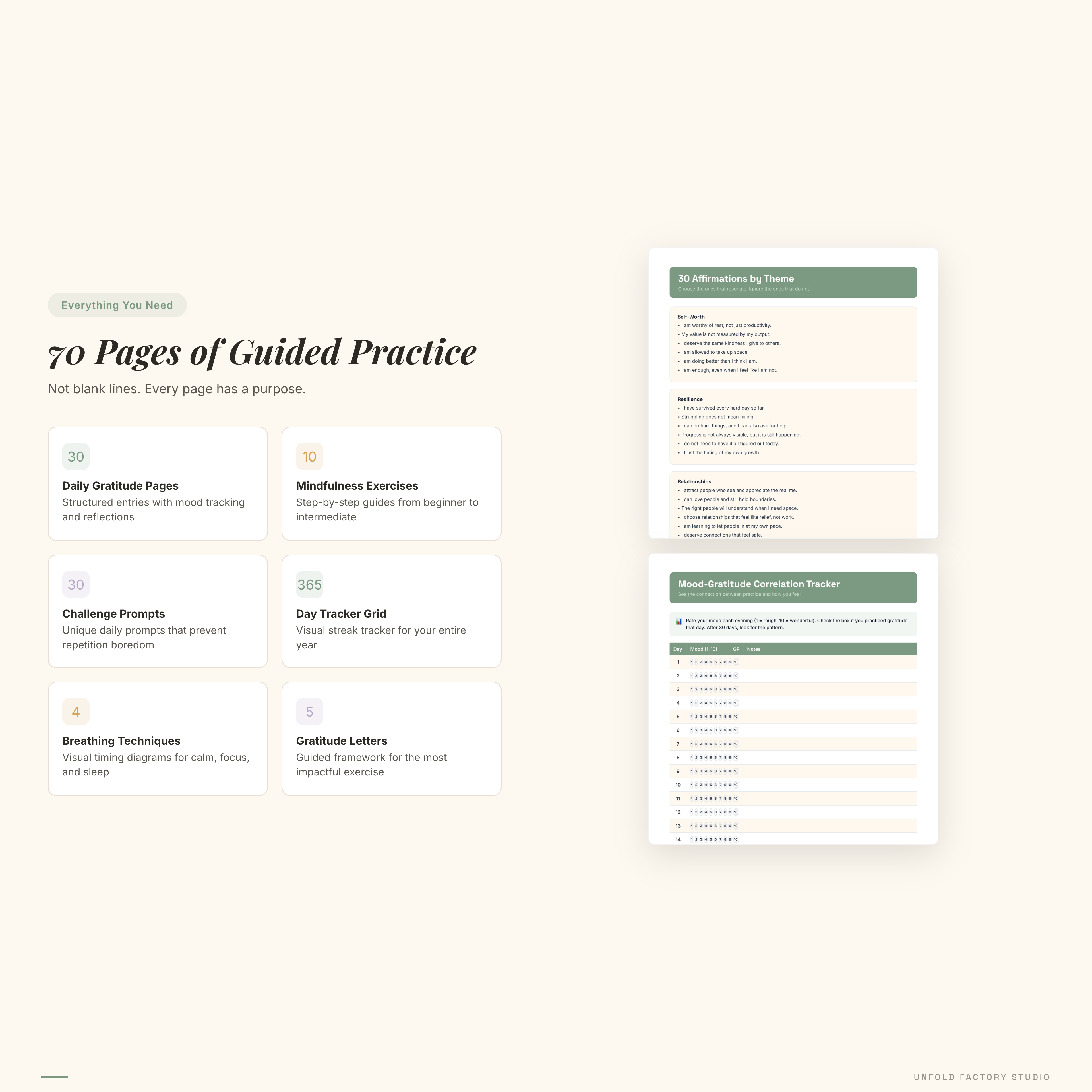 Q: How many pages are included? A: 70 pages total, including 30 daily gratitude pages, 10 guided mindfulness exercises, 5 gratitude letter templates, a 30-day challenge, a 365-day tracker, breathing exercise reference, body scan guide, affirmation pages, and more.