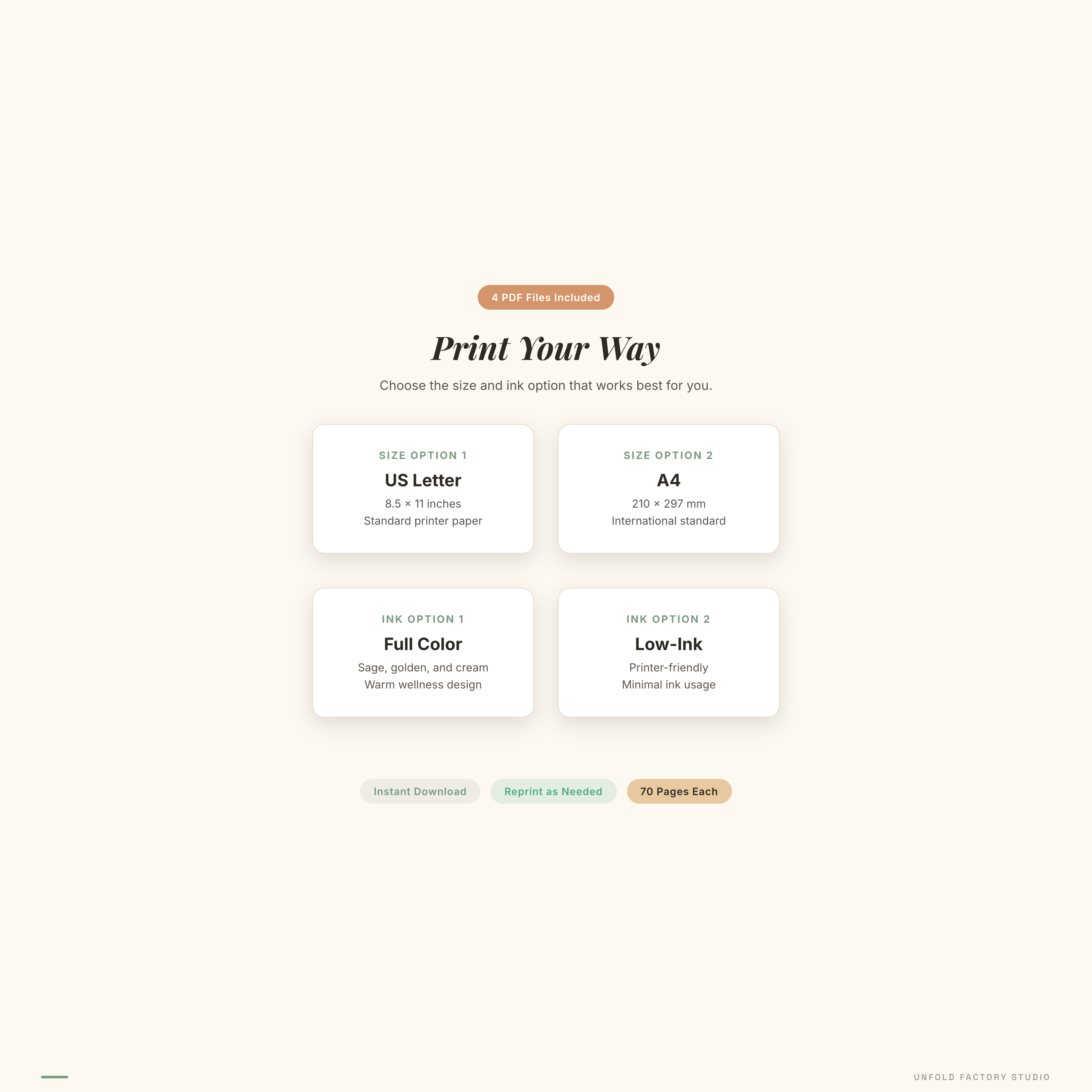 Q: What format is this in? A: You receive 4 PDF files: US Letter and A4, each in full color and low-ink (printer-friendly) versions. Print at home or at a print shop. No special software needed.