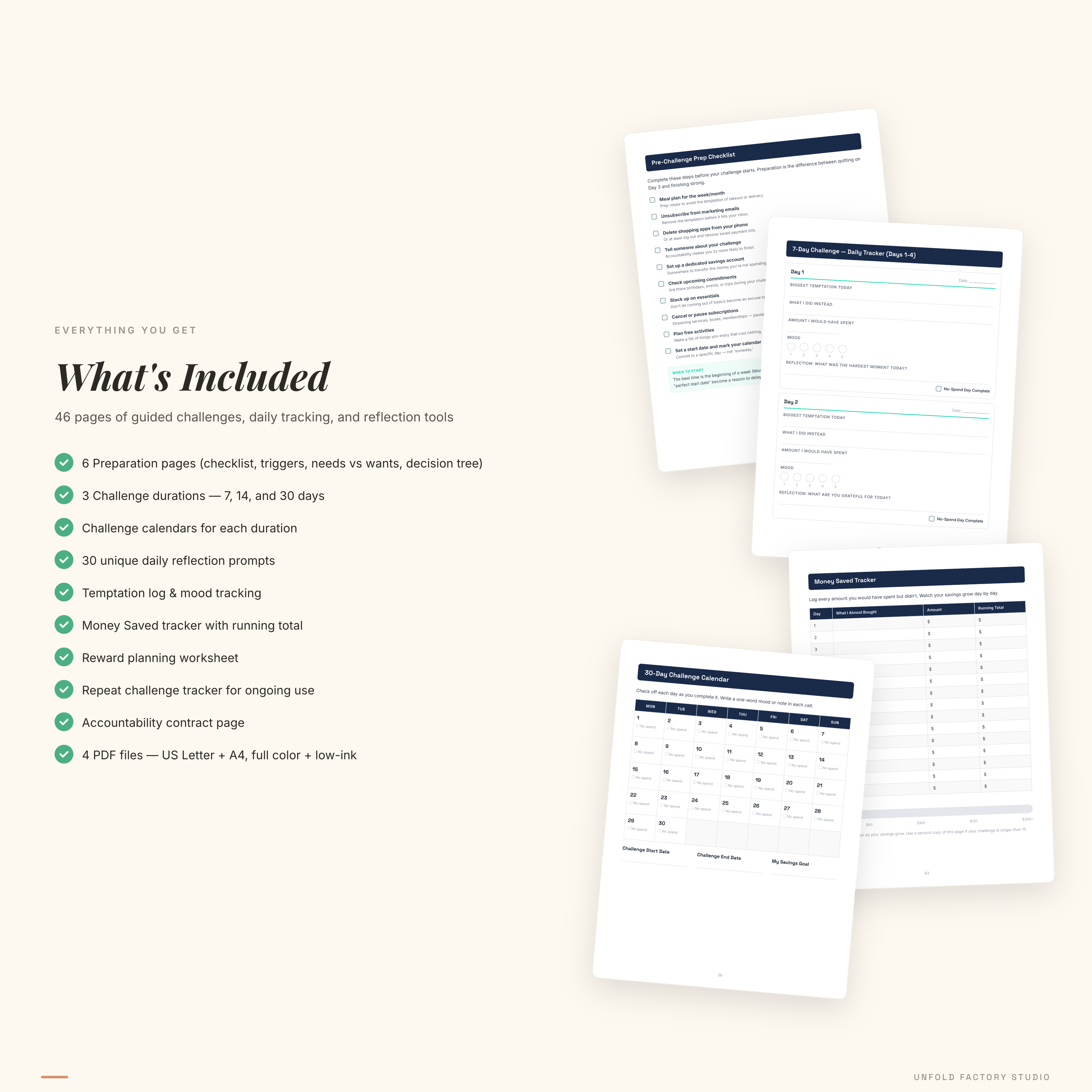 ✅ INSTANT DOWNLOAD — A complete 44-page printable challenge kit to help you stop overspending and start saving real money.