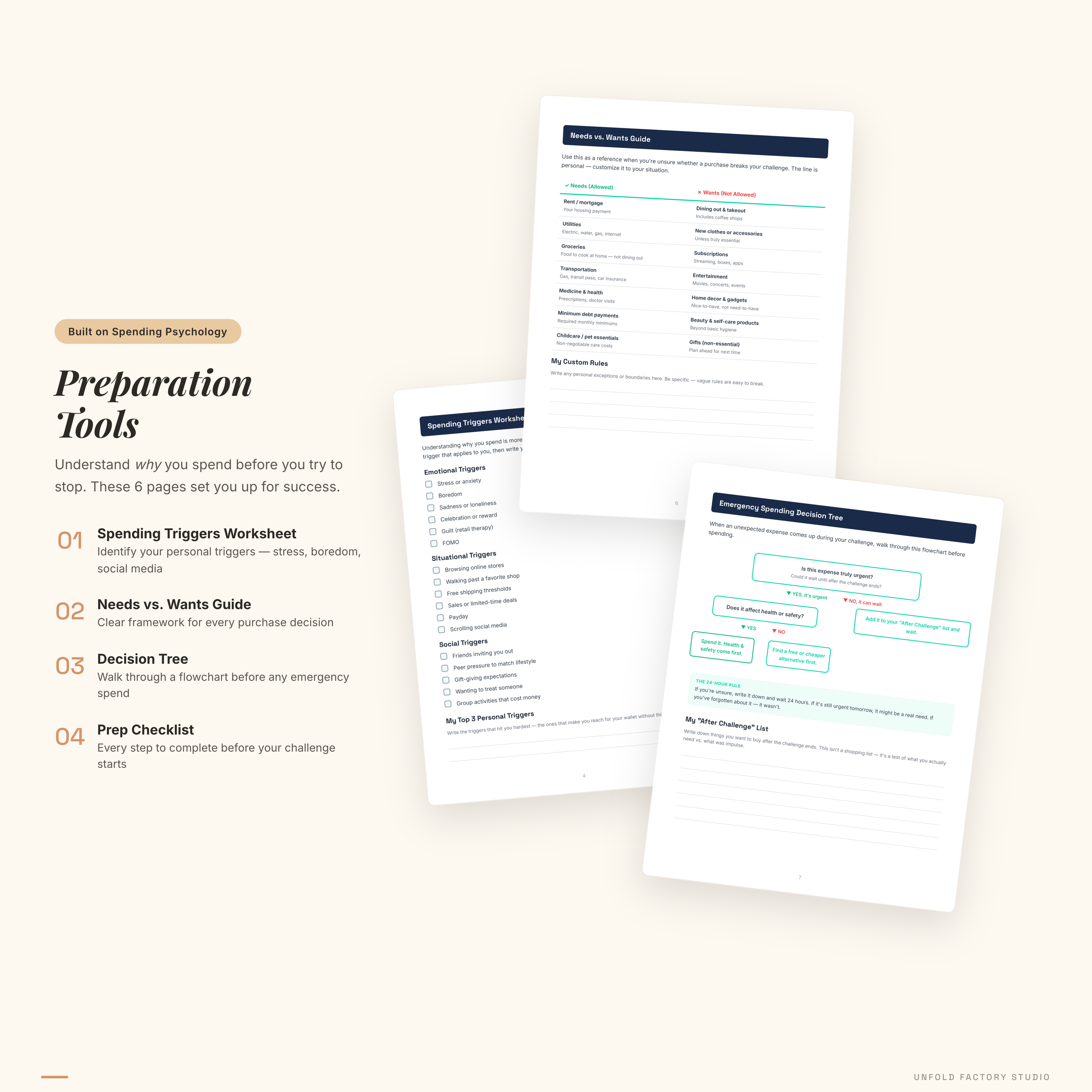 Preparation Tools: • Pre-Challenge Prep Checklist — 10 steps to set yourself up before Day 1 • Spending Triggers Worksheet — identify your emotional, situational, and social spending triggers • Needs vs. Wants Guide — clear framework for deciding what counts during the challenge • Emergency Spending Decision Tree — a flowchart for when unexpected expenses come up