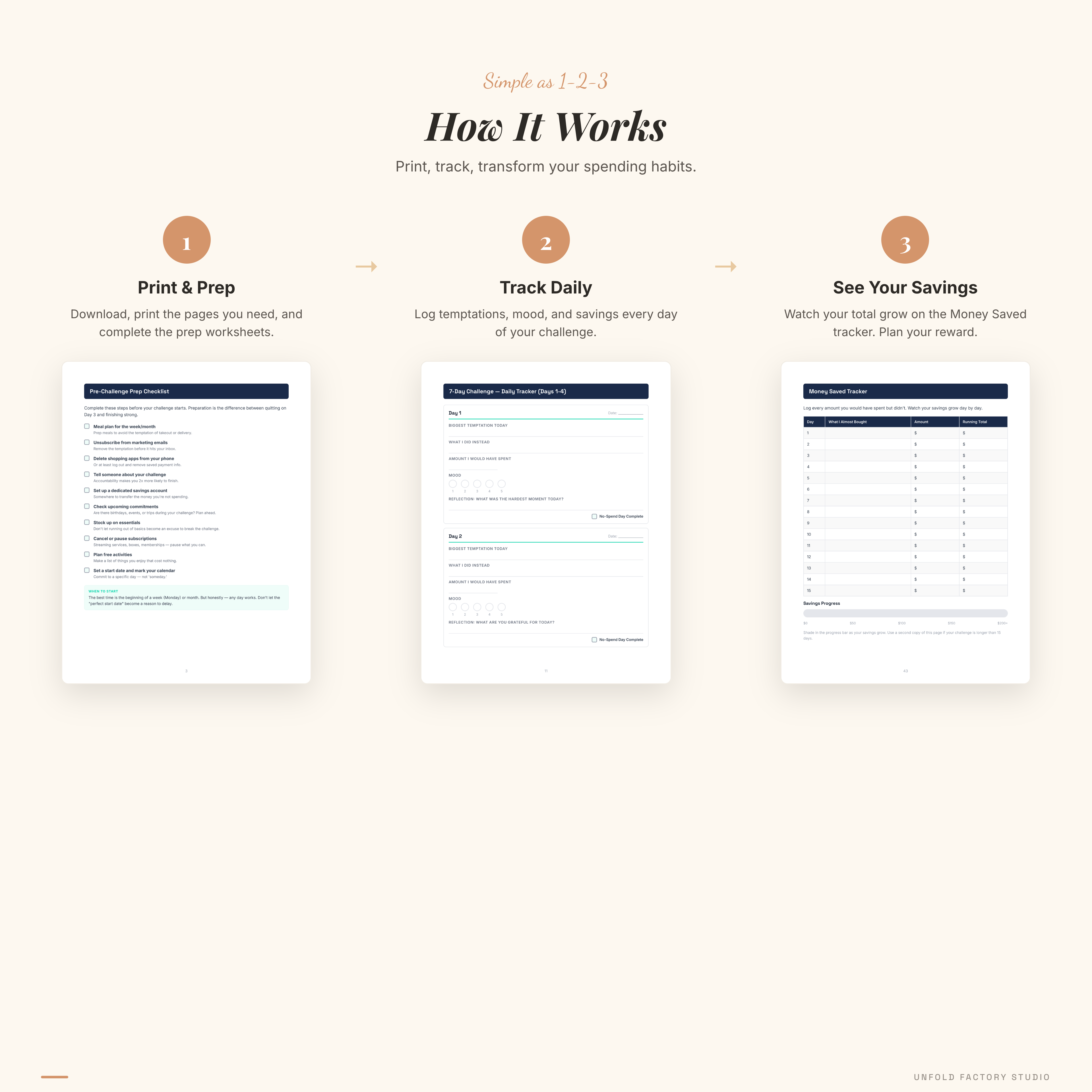 Results & Rewards: • Money Saved Tracker — running tally with visual progress thermometer • Reward Planning Page — decide how to allocate your savings (debt, savings, investing, one intentional treat) • Repeat Challenge Tracker — log multiple challenges and watch lifetime savings grow • Accountability Contract — sign with a friend or partner to double your completion rate
