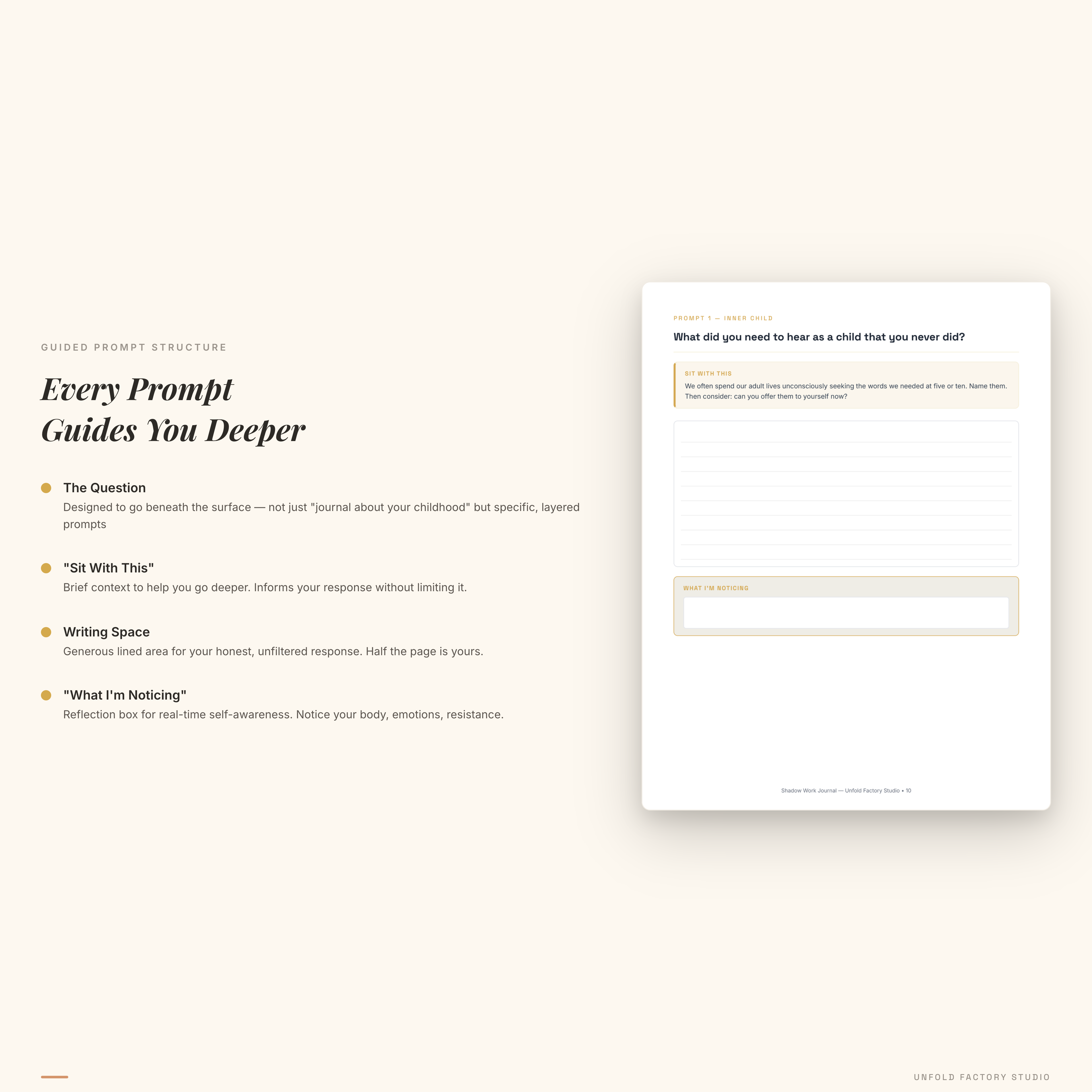 Q: Do I need to know anything about shadow work to use this? A: No prior knowledge needed. The journal includes a full introduction to shadow work concepts, how to use the journal, and emotional safety guidelines. Every prompt has a “Sit With This” section that provides context so you never feel lost.