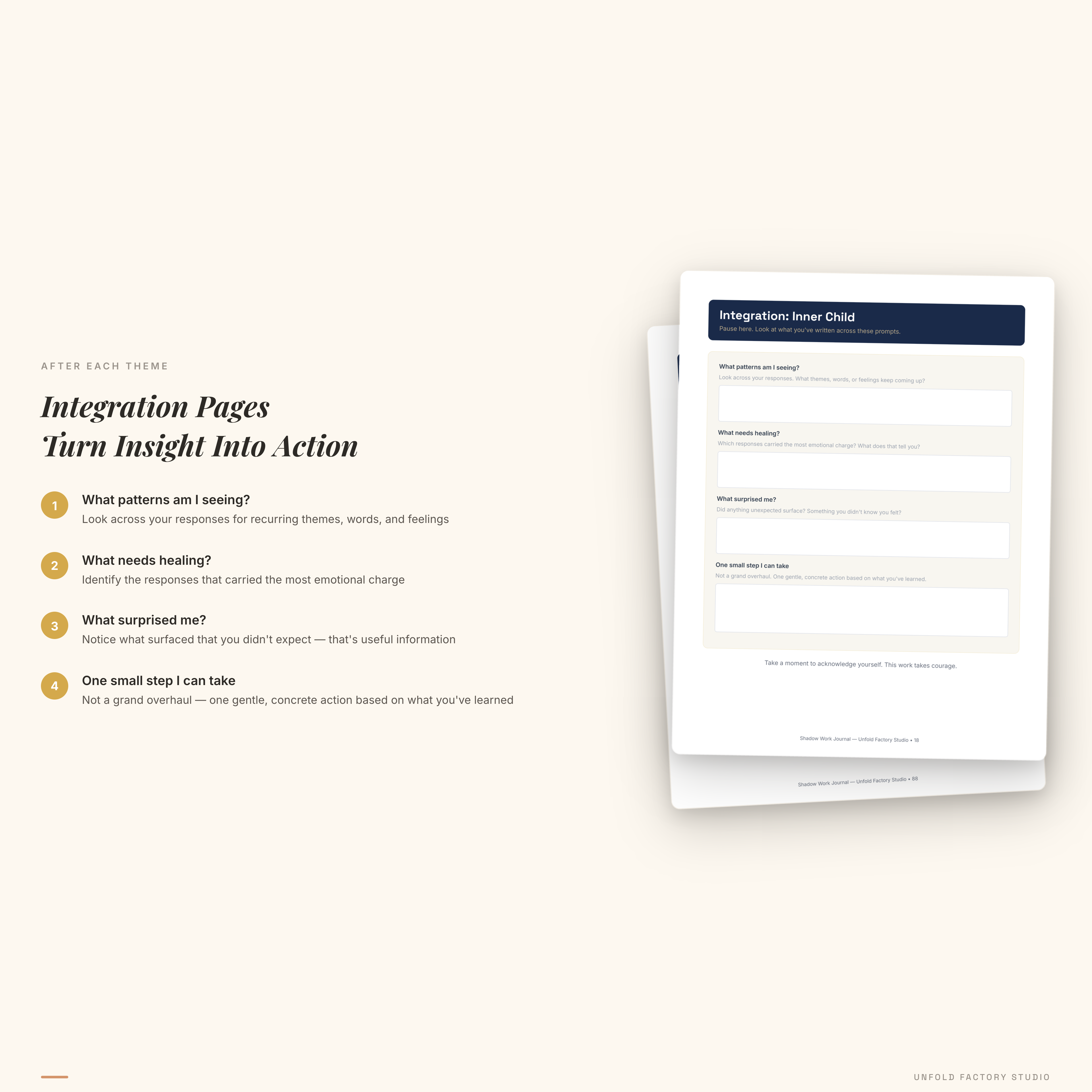 - 8 Integration pages — one after each theme to find patterns, name what needs healing, and choose one small step forward