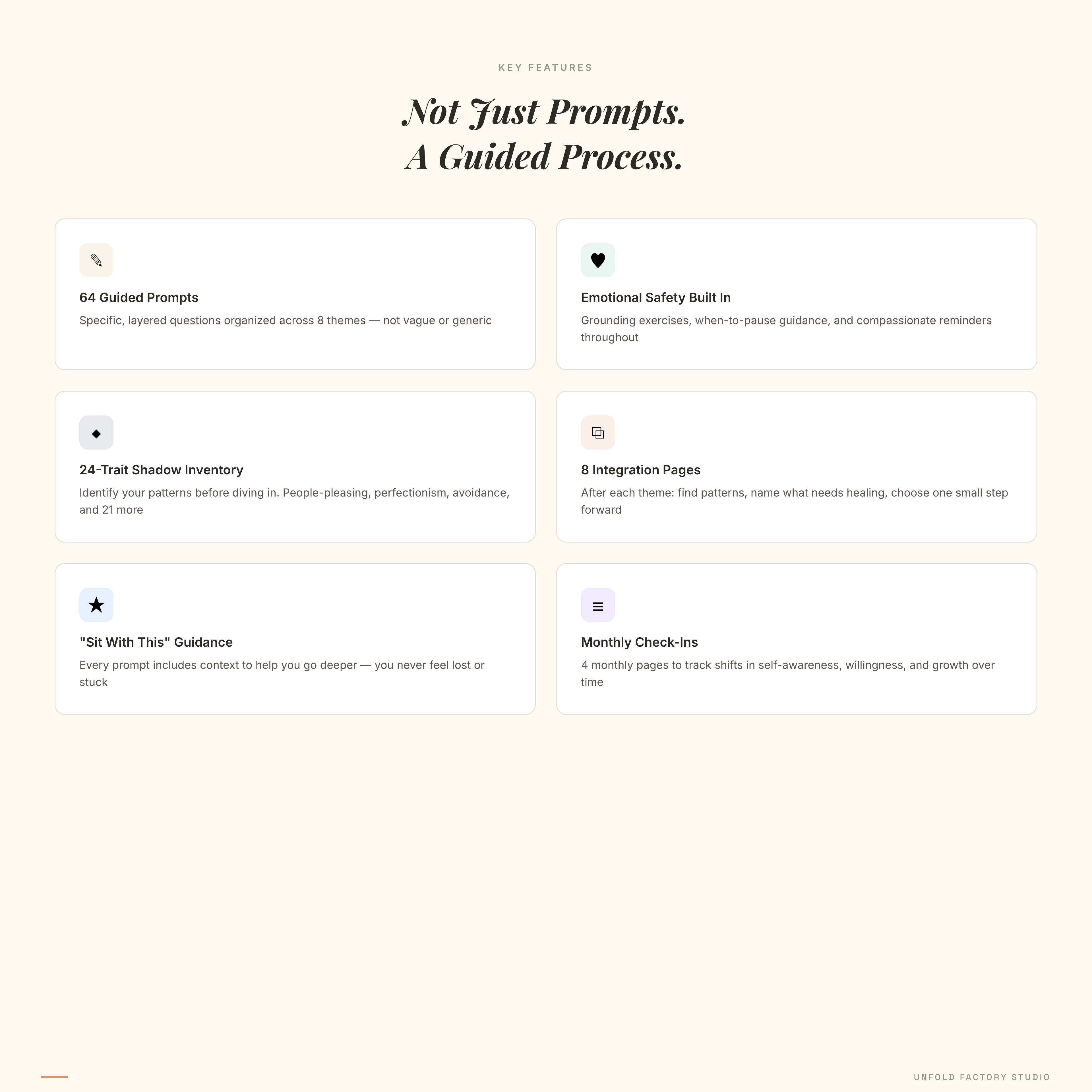 Most shadow work journals are just lists of questions with blank pages. This one guides you through the process — with context for every prompt, emotional safety guidelines before you begin, integration exercises after each theme, and a monthly check-in to track your growth. The tone is warm and grounded. No clinical jargon. No toxic positivity. Just honest self-exploration at your own pace.