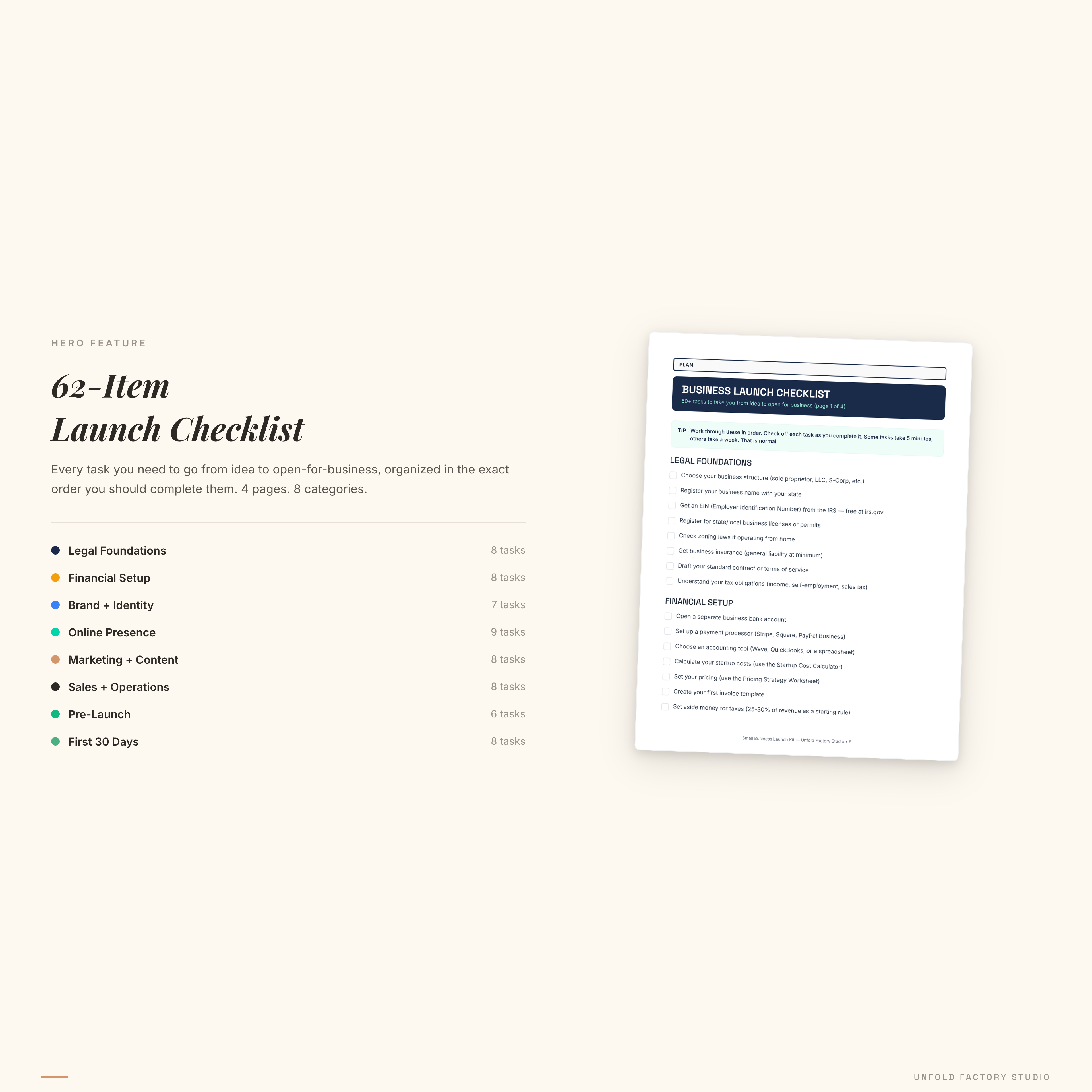 - 62-item Business Launch Checklist spanning 8 categories (Legal, Financial, Brand, Online, Marketing, Sales, Pre-Launch, First 30 Days) across 4 pages — the hero of this kit