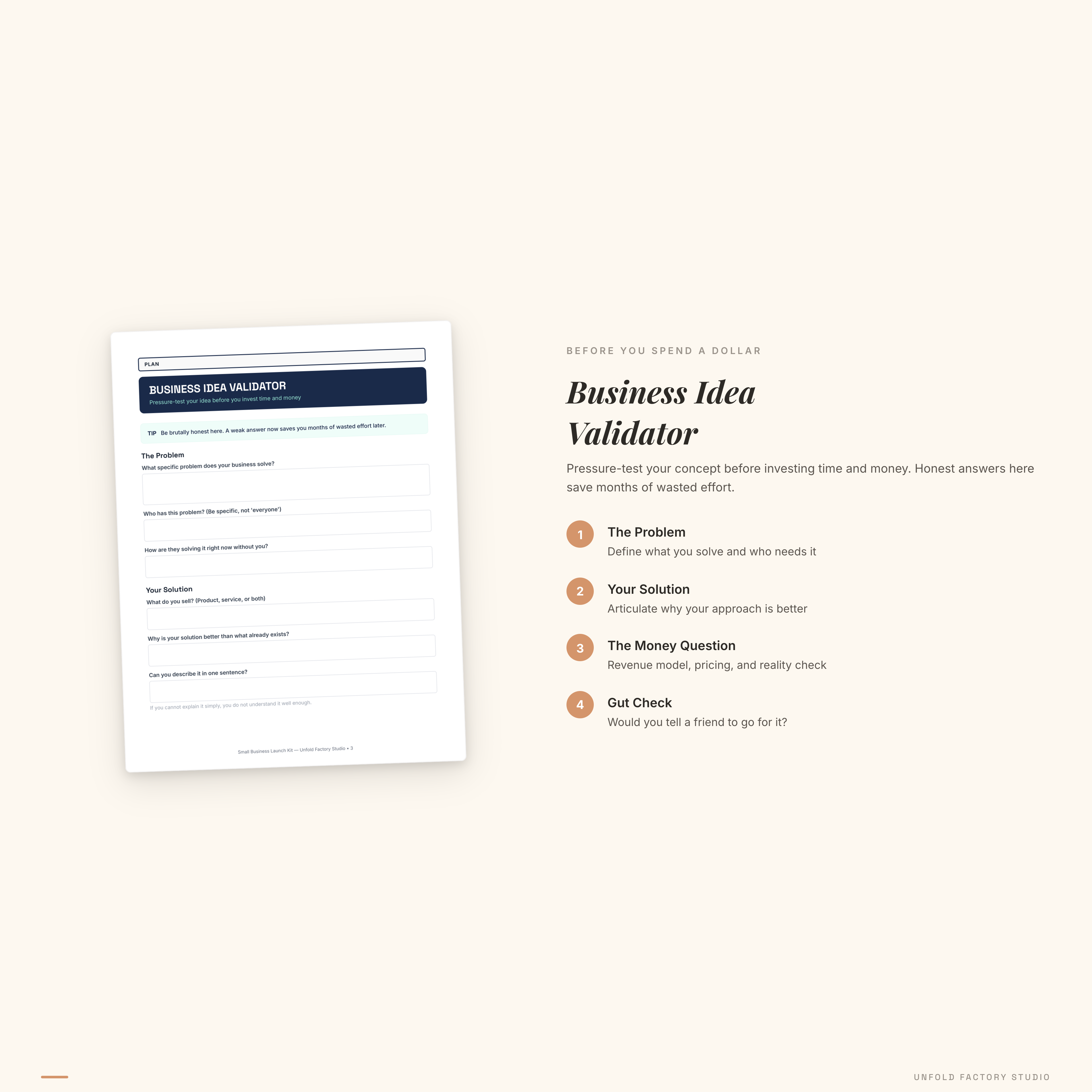The Small Business Launch Kit from Unfold Factory Studio is a 55-page printable PDF workbook that walks you through every step of starting a business — from pressure-testing your idea to tracking your first 90 days of revenue. No corporate jargon, no fluff, no MBA required. Just practical worksheets you print, fill in with a pen, and actually use.