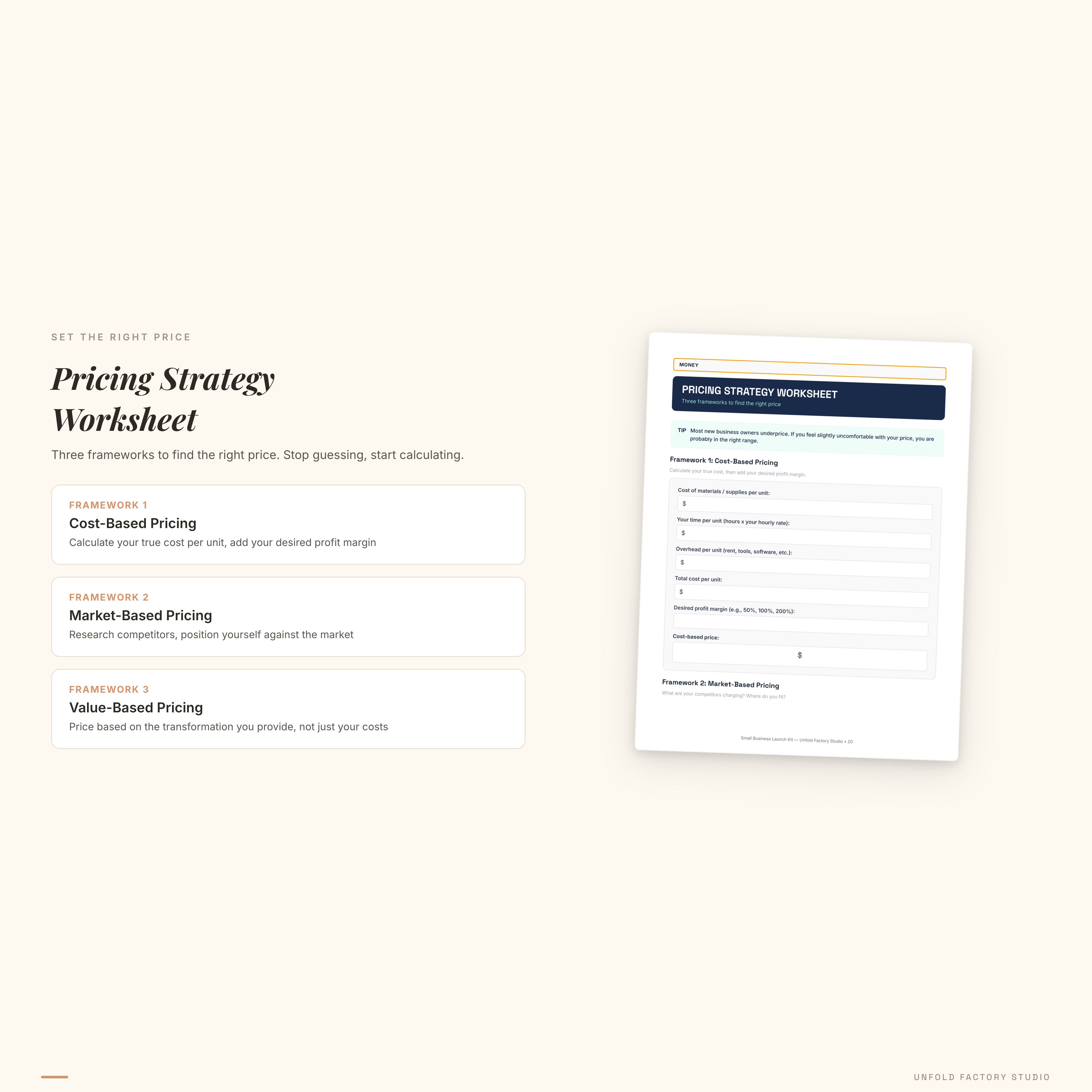 - Pricing Strategy Worksheet with 3 frameworks (cost-based, market-based, value-based) so you set the right price the first time