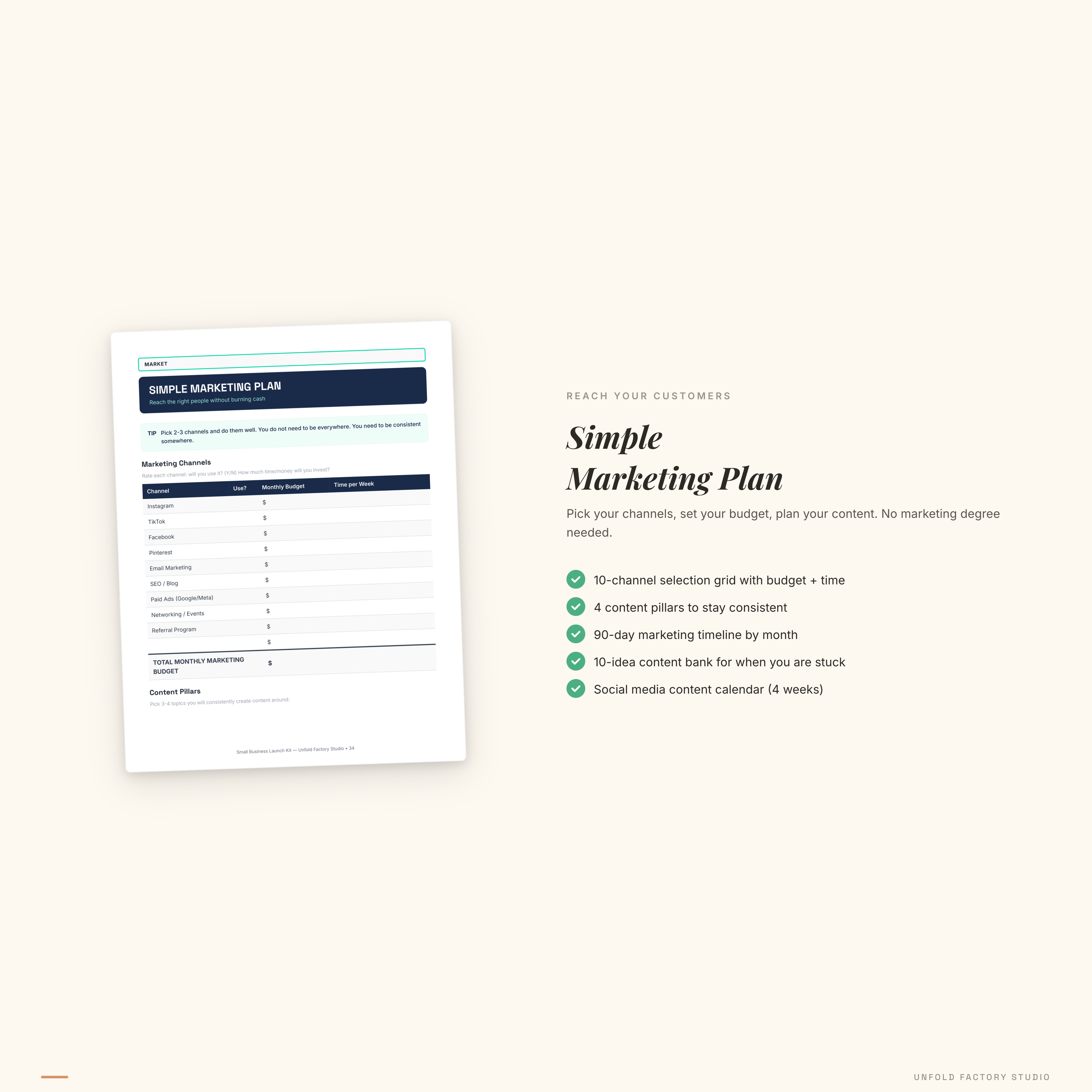 - Simple Marketing Plan with channel selection, content pillars, 90-day marketing timeline, and a 10-idea content bank