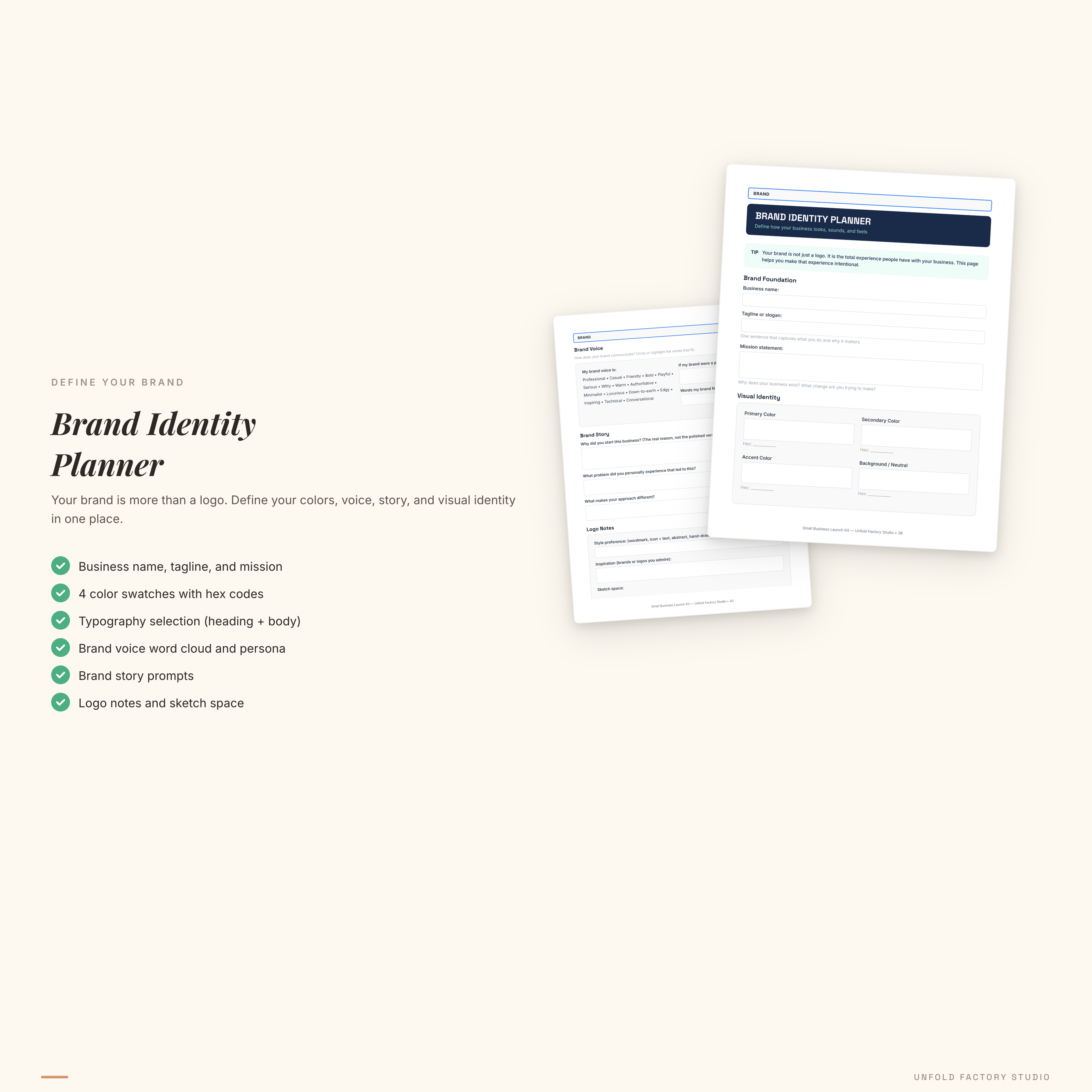 - Brand Identity Planner with color swatches, typography, brand voice, brand story prompts, and logo sketch space