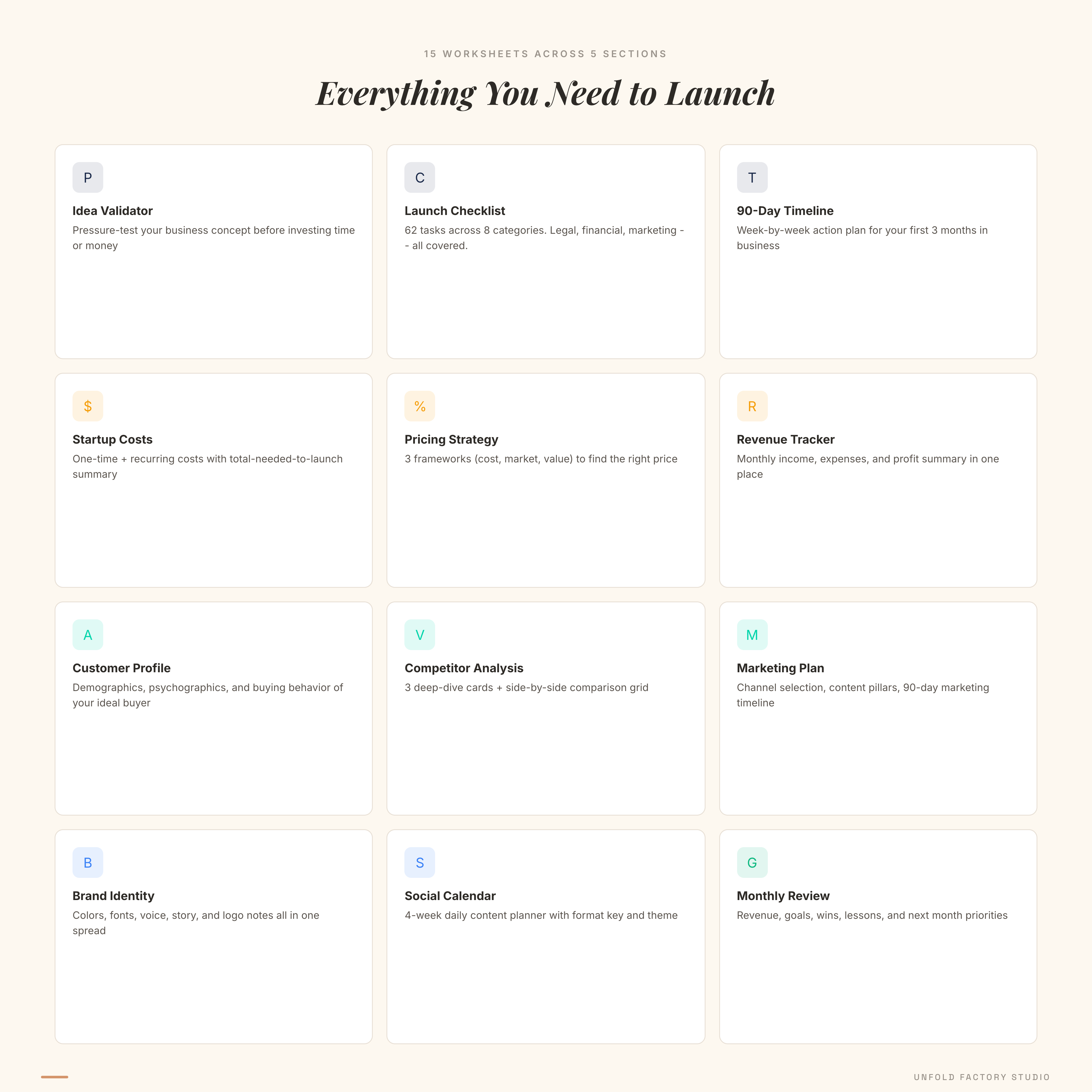 5 sections. 15 worksheets. 55 pages. Everything organized by category: Plan, Money, Market, Brand, and Launch.