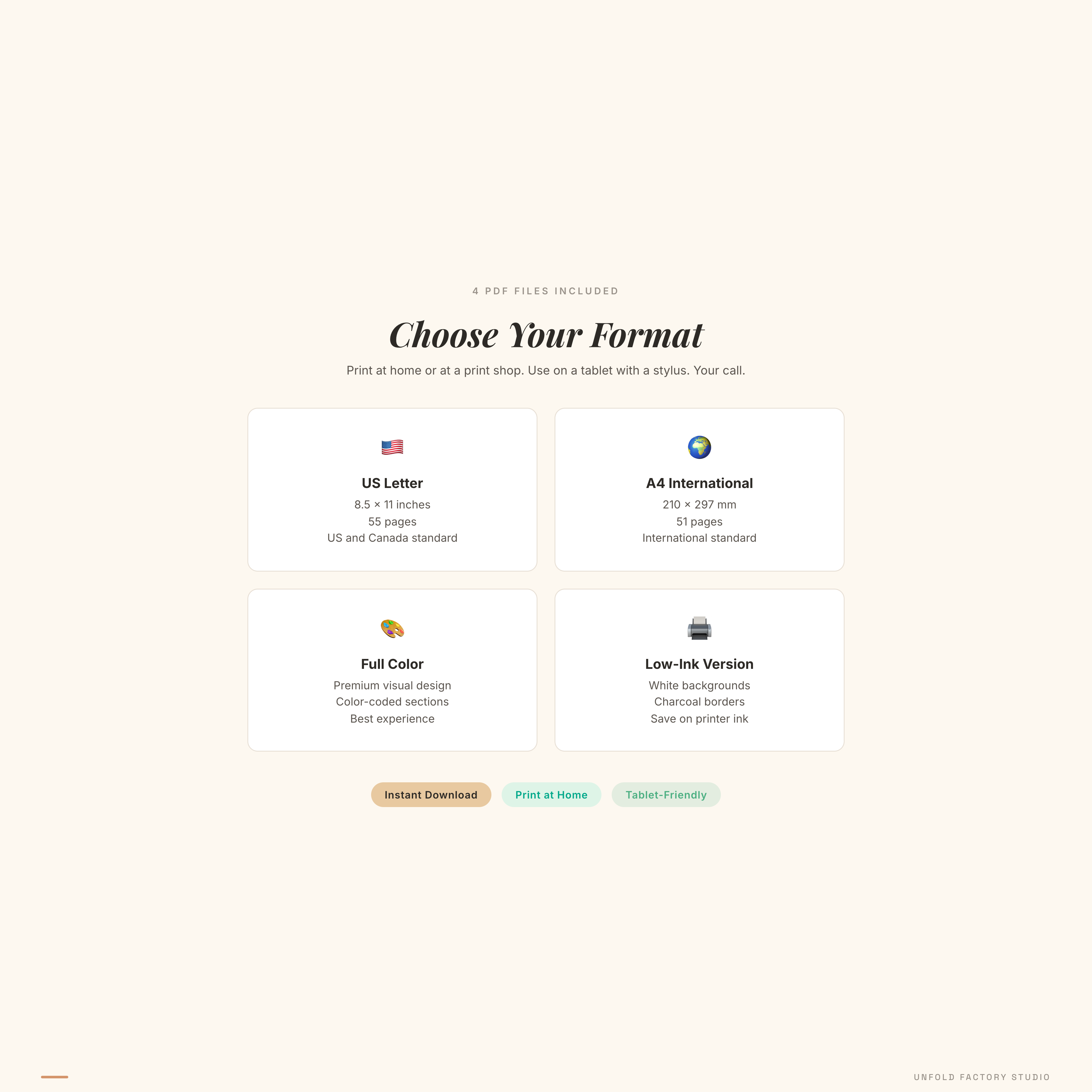 Q: What format is this in? A: You receive 4 PDF files — US Letter and A4 sizes, each in full color and low-ink versions. PDFs work on any device and can be printed at home or at a print shop.
