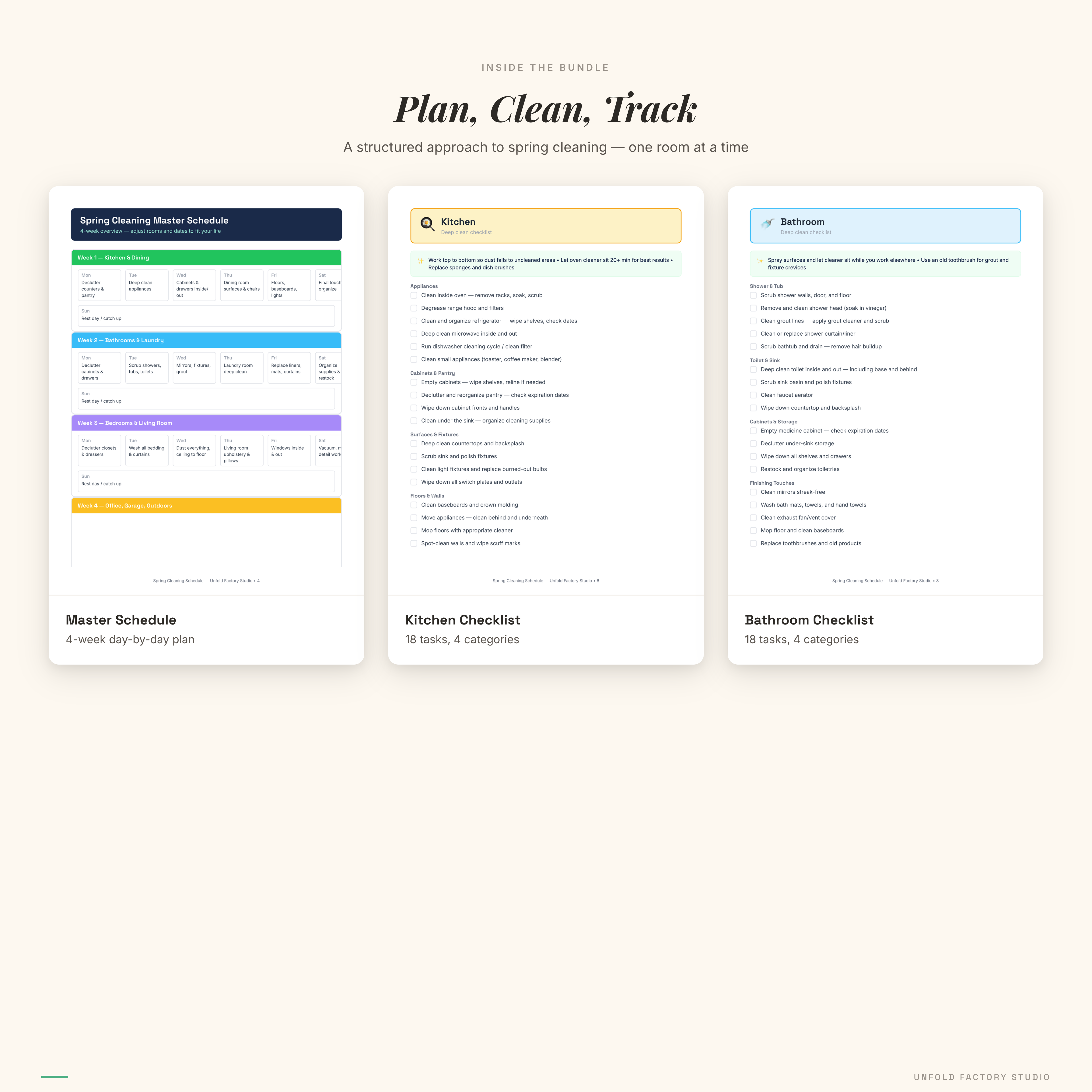 Perfect for homeowners and renters who want a room-by-room plan instead of one overwhelming to-do list. Perfect for busy parents who need to break cleaning into small sessions across multiple weeks. Perfect for anyone who loves checking things off a list and wants to see real progress. Perfect for first-time homeowners tackling their first deep clean.