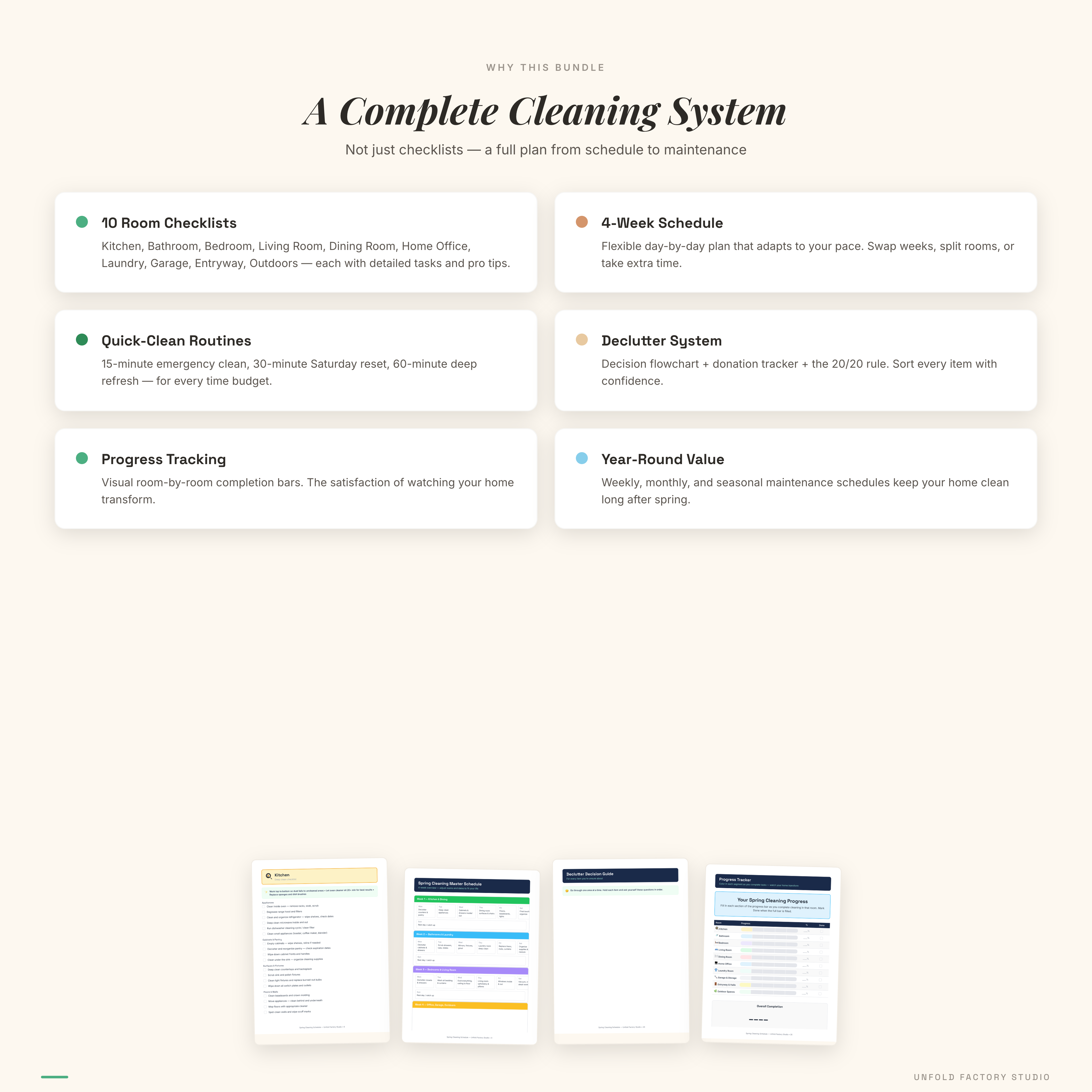 Most spring cleaning checklists are a single page with a generic task list. This bundle covers the full cleaning lifecycle — scheduling, room-by-room execution, supply tracking, decluttering decisions, donation logging, home maintenance, and ongoing upkeep. Color-coded rooms with unique icons for quick navigation. A progress tracker to see every room completed. And quick-clean cheat sheets for the days when you only have 15 minutes.