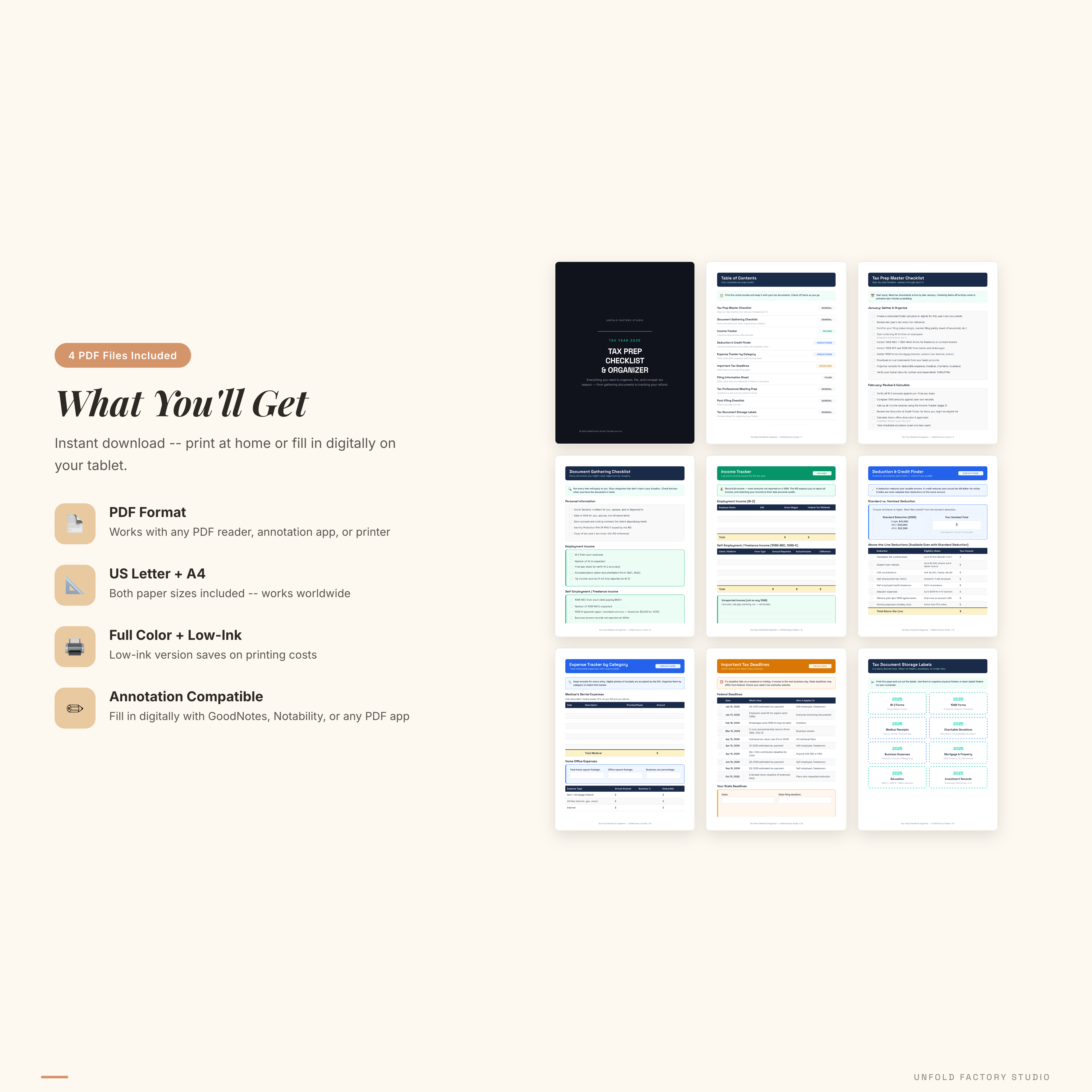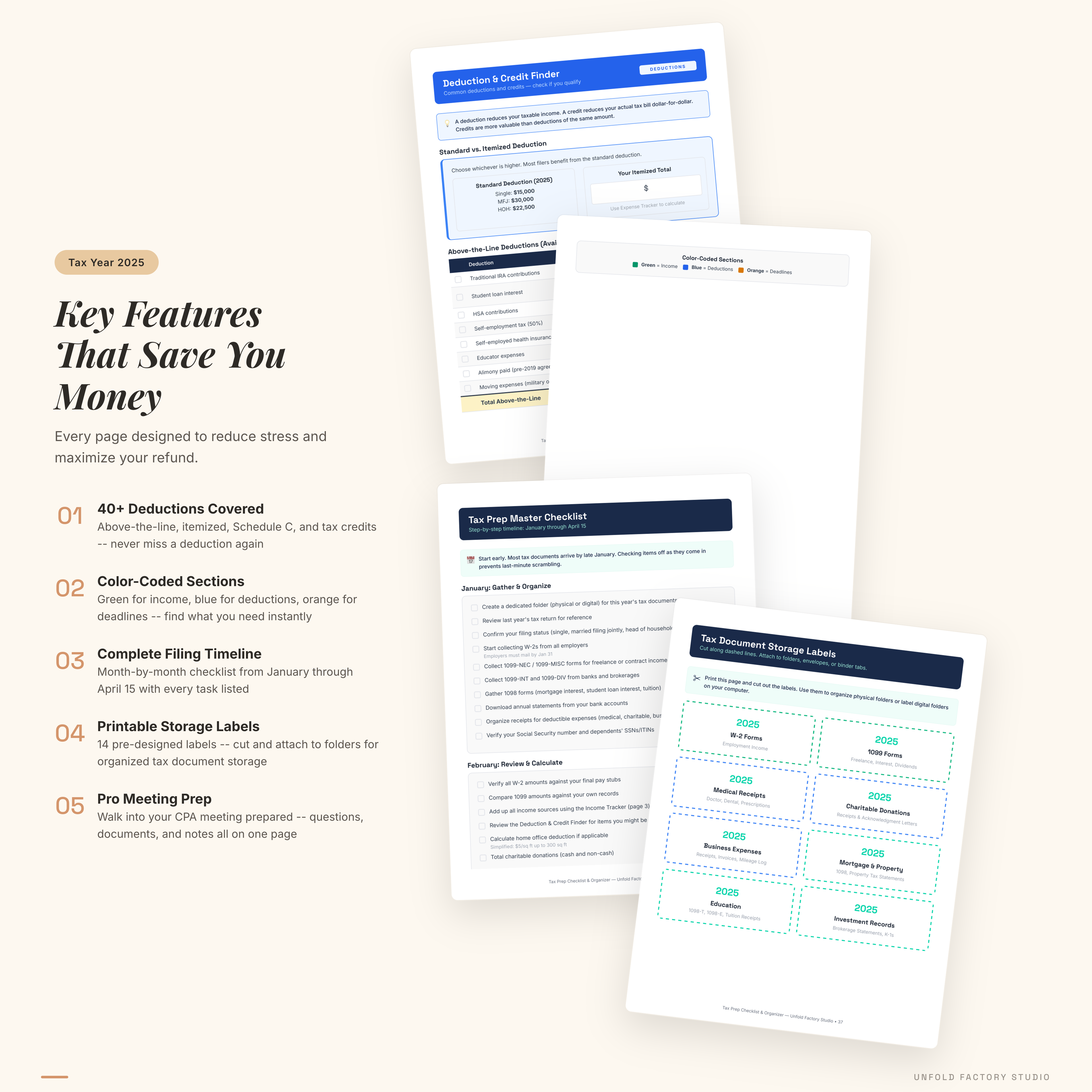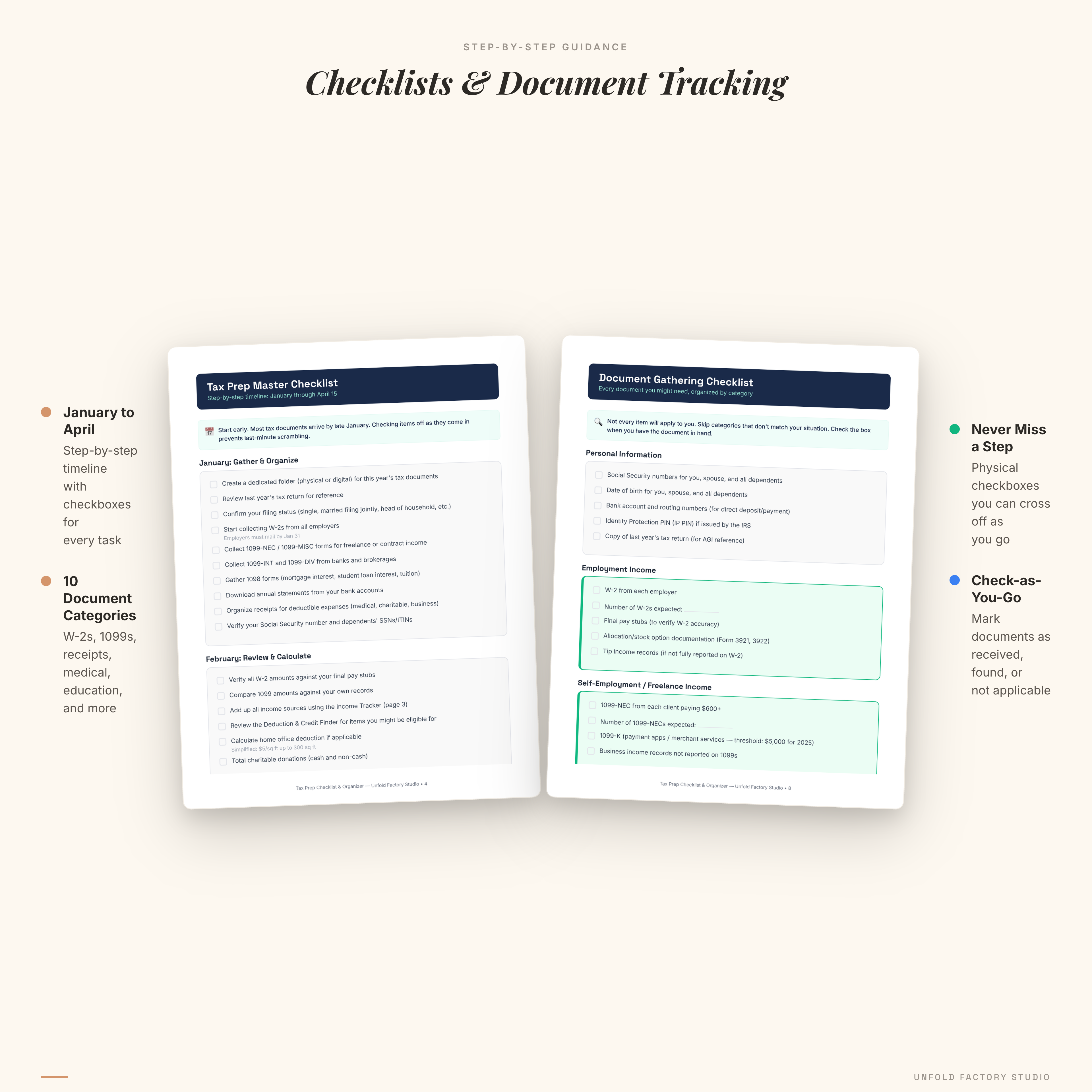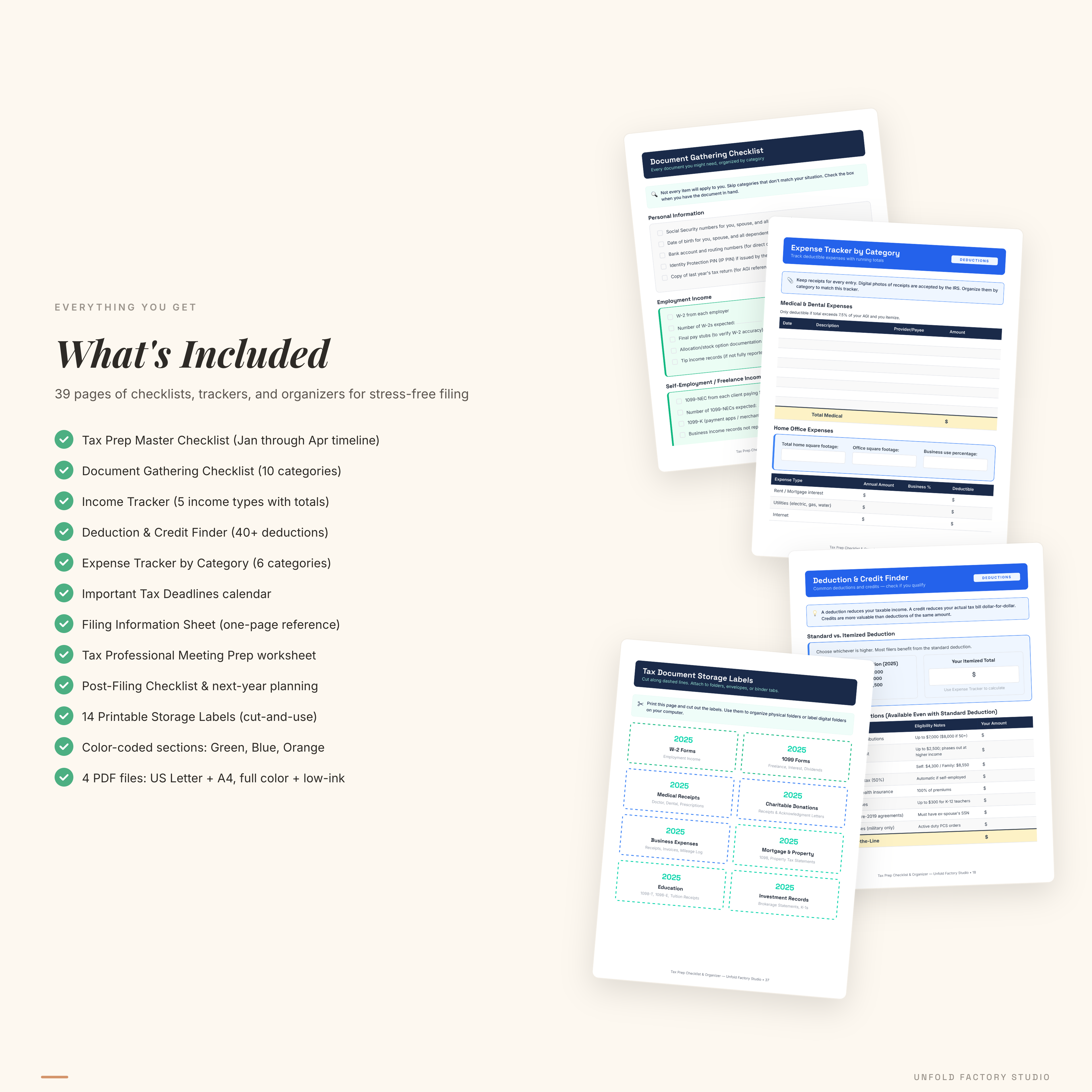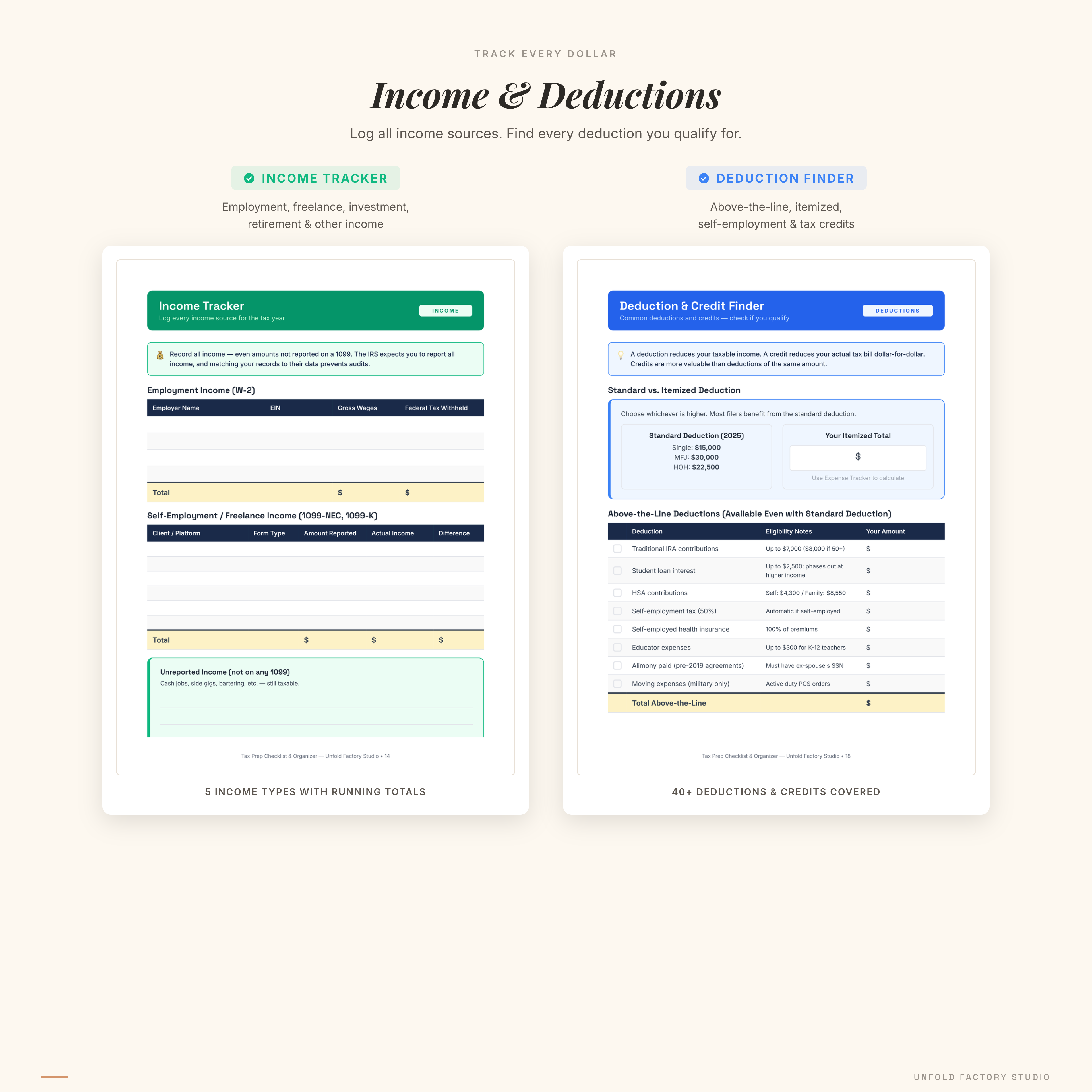 Perfect for W-2 employees who want a clear system for organizing tax documents. Perfect for freelancers juggling multiple income sources and deductions. Perfect for first-time filers who need a step-by-step guide through the process. Perfect for anyone who has ever scrambled to find a receipt or missed a deduction.