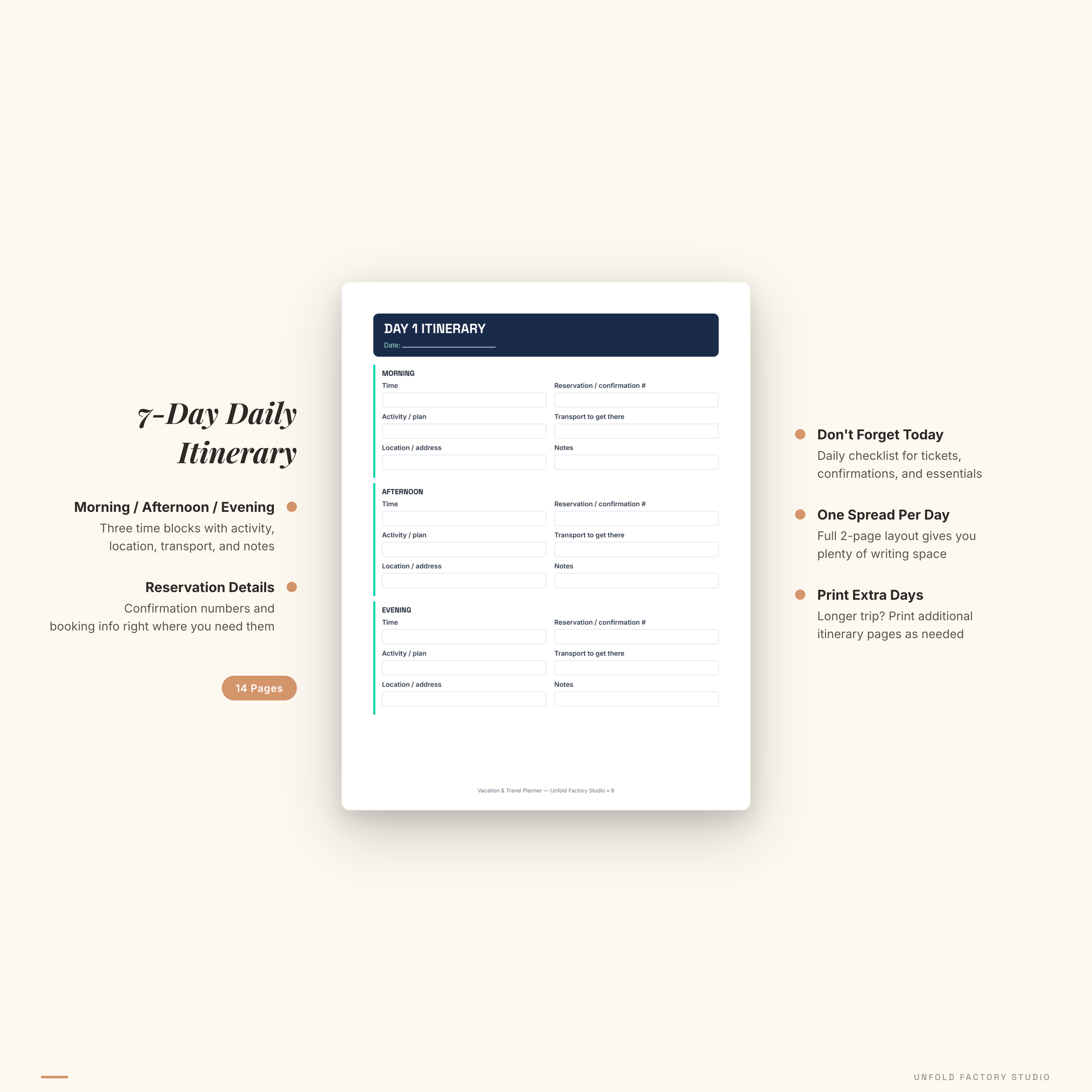 7-Day Daily Itineraries (14 pages) — one spread per day with morning, afternoon, and evening time blocks. Each day includes activity fields, reservation info, transport notes, and a “Don’t Forget Today” checklist.