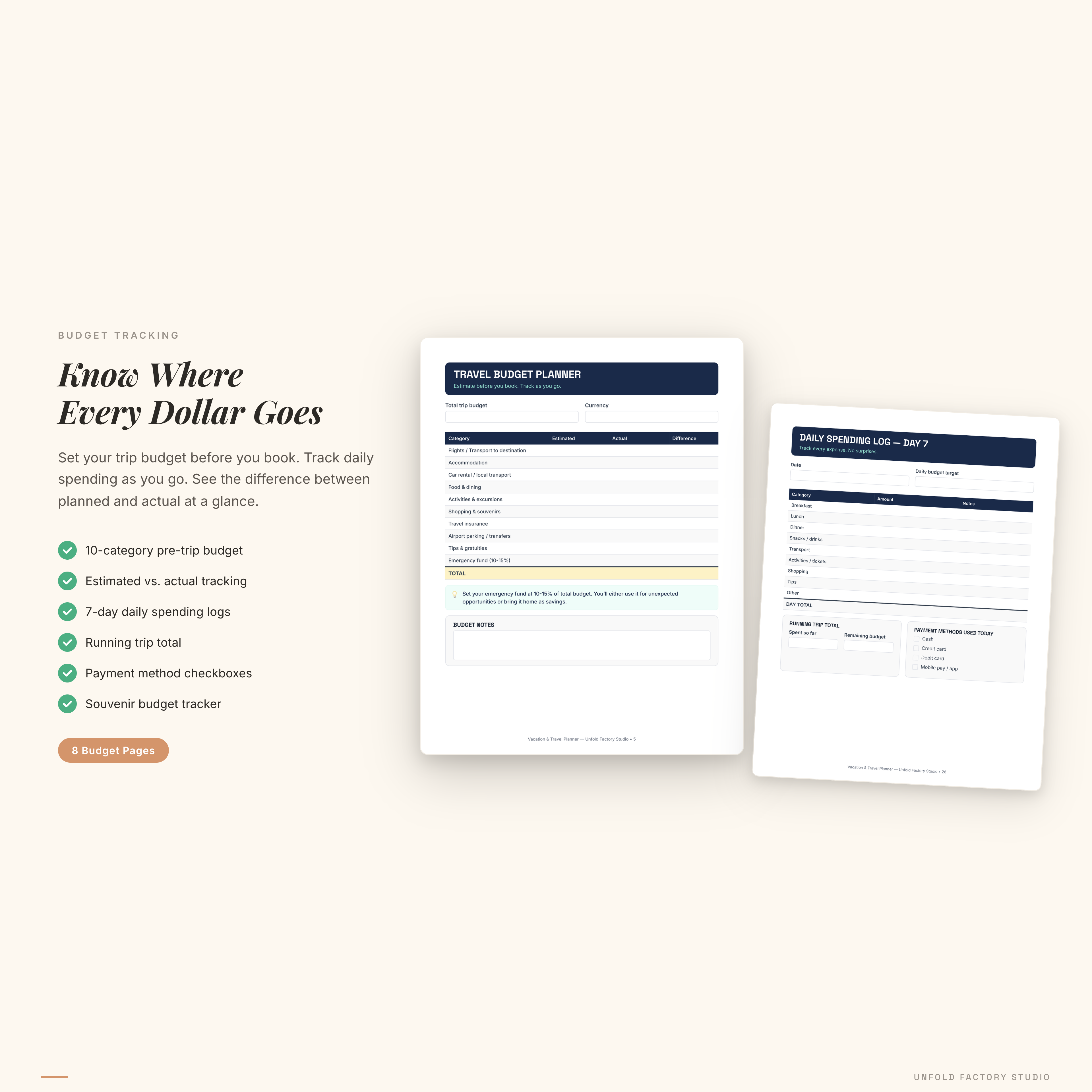 Travel Budget Planner — pre-trip budget with 10 categories (flights, accommodation, food, activities, shopping, insurance, tips, and more). Estimated vs. actual columns with difference tracking so you see exactly where your money goes.