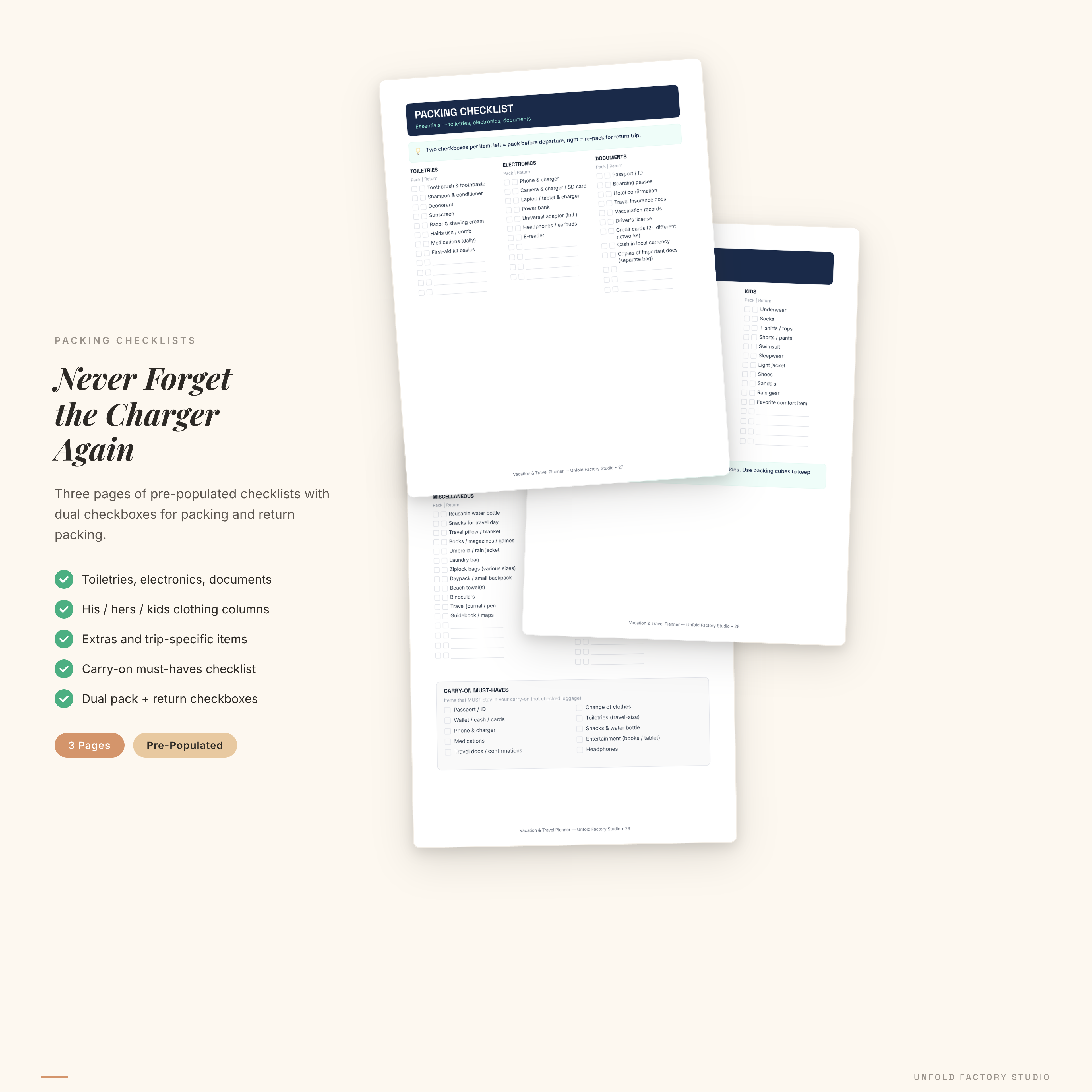 Packing Checklists (3 pages) — essentials (toiletries, electronics, documents), clothing with his/hers/kids columns, extras and trip-specific items, plus carry-on must-haves. Every item has dual checkboxes: one for packing, one for return packing.