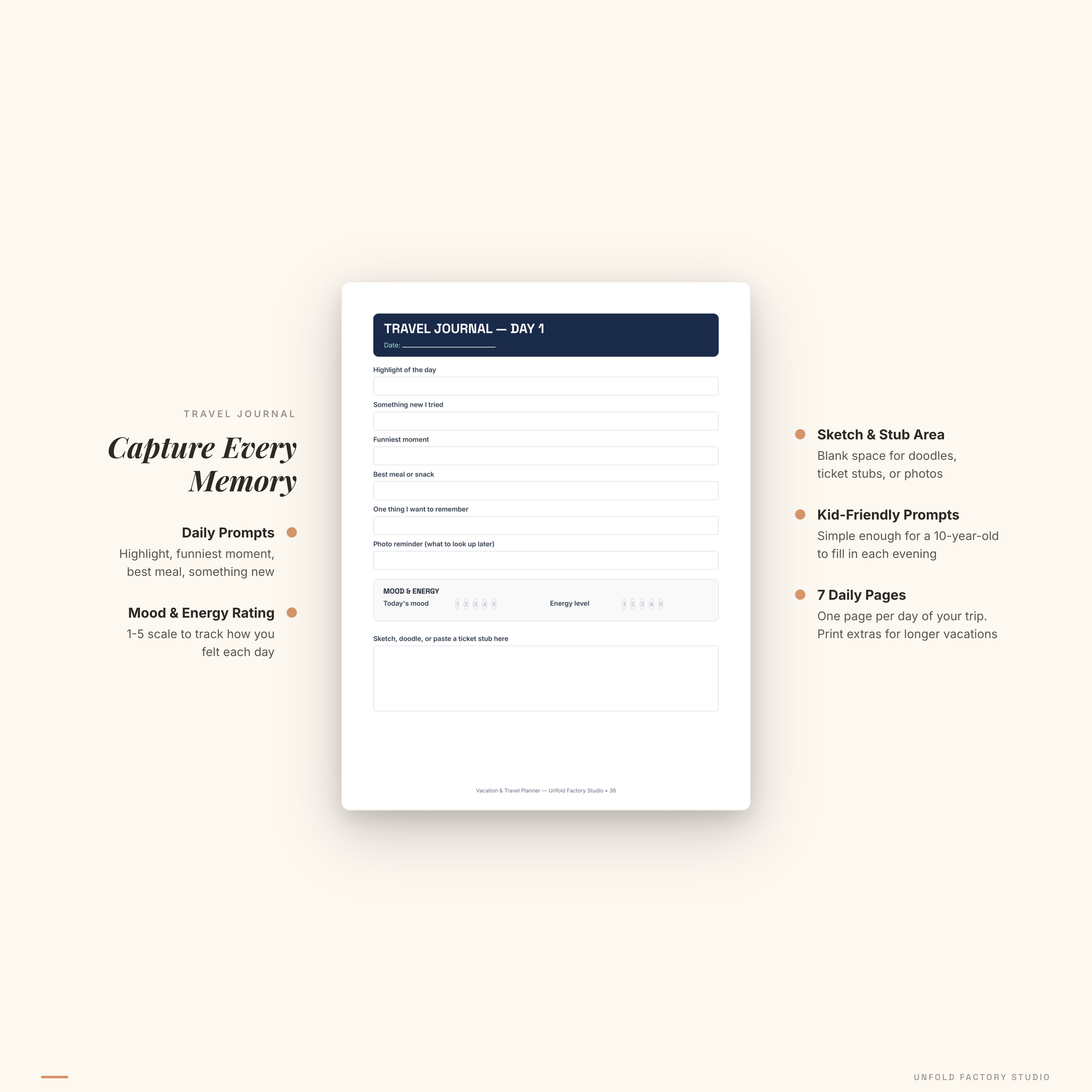 7-Day Travel Journal (7 pages) — daily reflection prompts: highlight of the day, something new tried, funniest moment, best meal, and photo reminders. Includes mood and energy rating scales and a sketch area for ticket stubs or doodles. Simple enough for kids to fill in too.