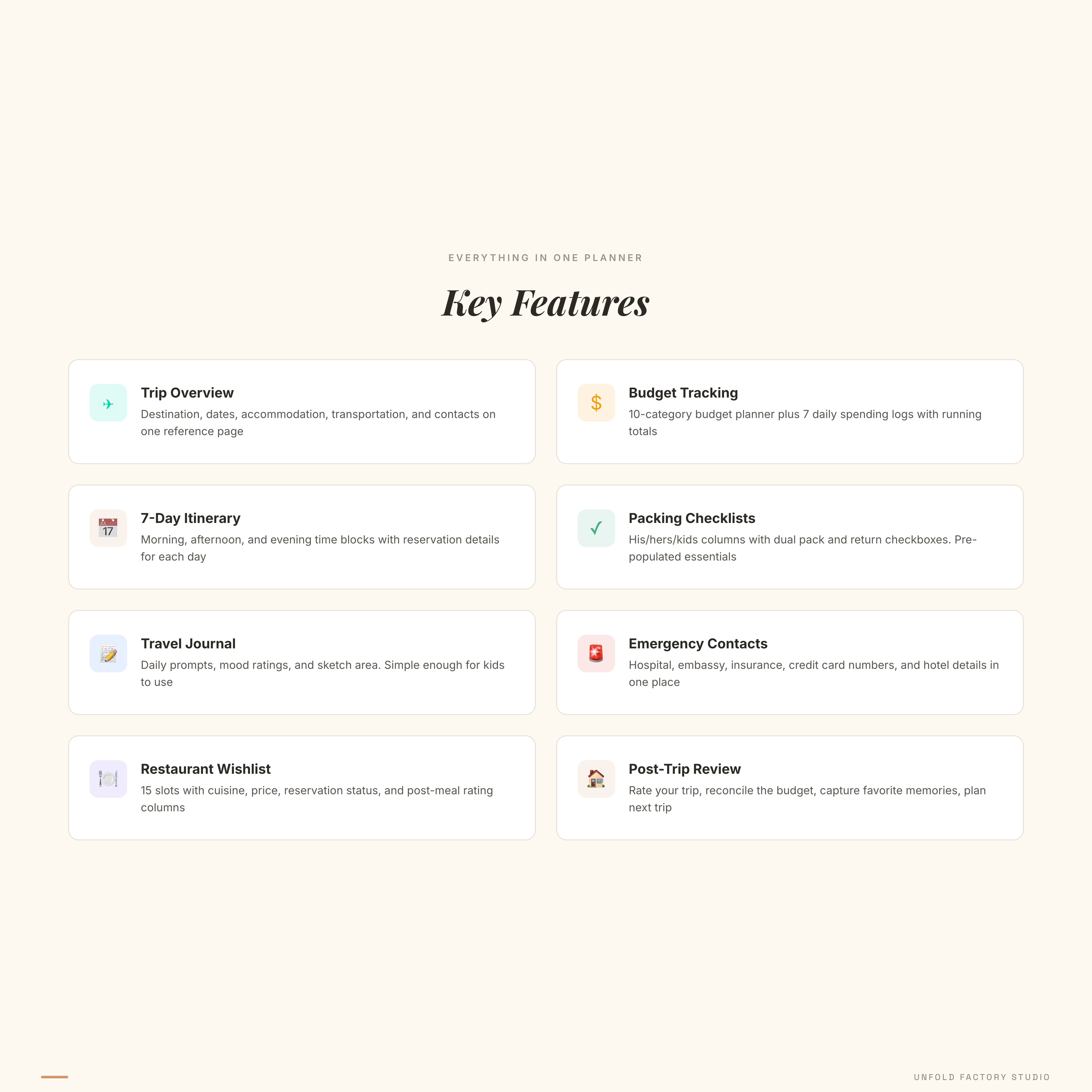Q: Does it work for international travel? A: Absolutely. Includes currency/exchange rate fields, embassy contacts, visa checklist, allergy translation cards, and key phrases in local language on the wallet cards.