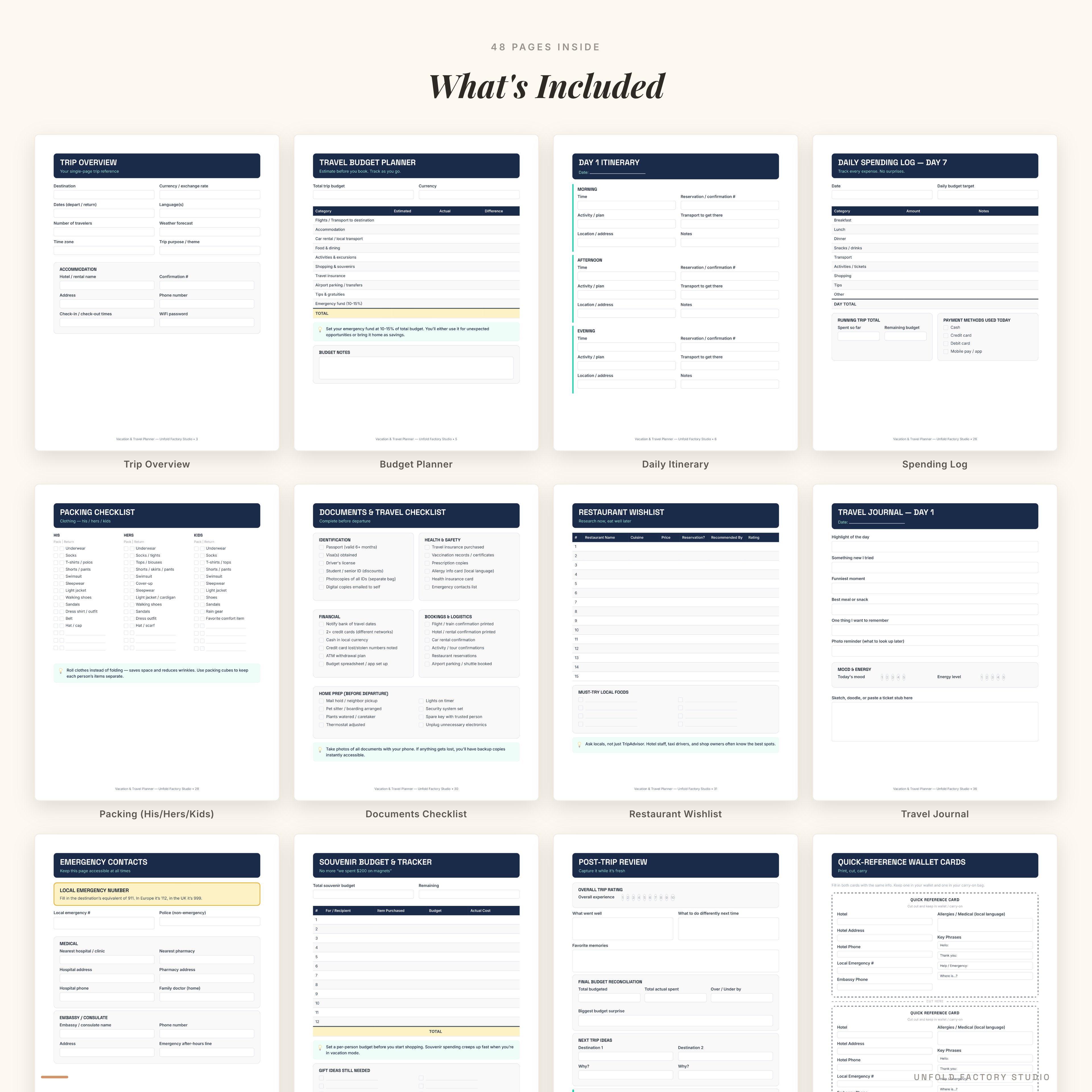 Most travel planners on Etsy are either a single itinerary page or a packing checklist. This is the full lifecycle: planning, budgeting, experiencing, and reflecting. The daily spending logs with running totals prevent budget blowouts. The his/hers/kids packing columns handle the reality of family travel. The travel journal turns memories into keepsakes. And the wallet-sized quick-reference cards with emergency contacts and local language phrases are something you will actually use at 2 AM in a foreign city.